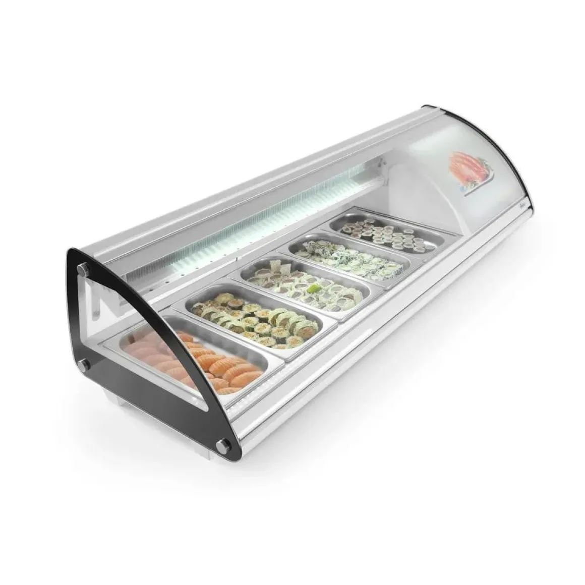 Het Arktic Sushi-display 5x GN 1/3 geeft toegang tot de containers via de schuifdeuren aan de achterkant maar ook via de gebogen glazen afdekking aan de voorkant die opgetild kan worden.
