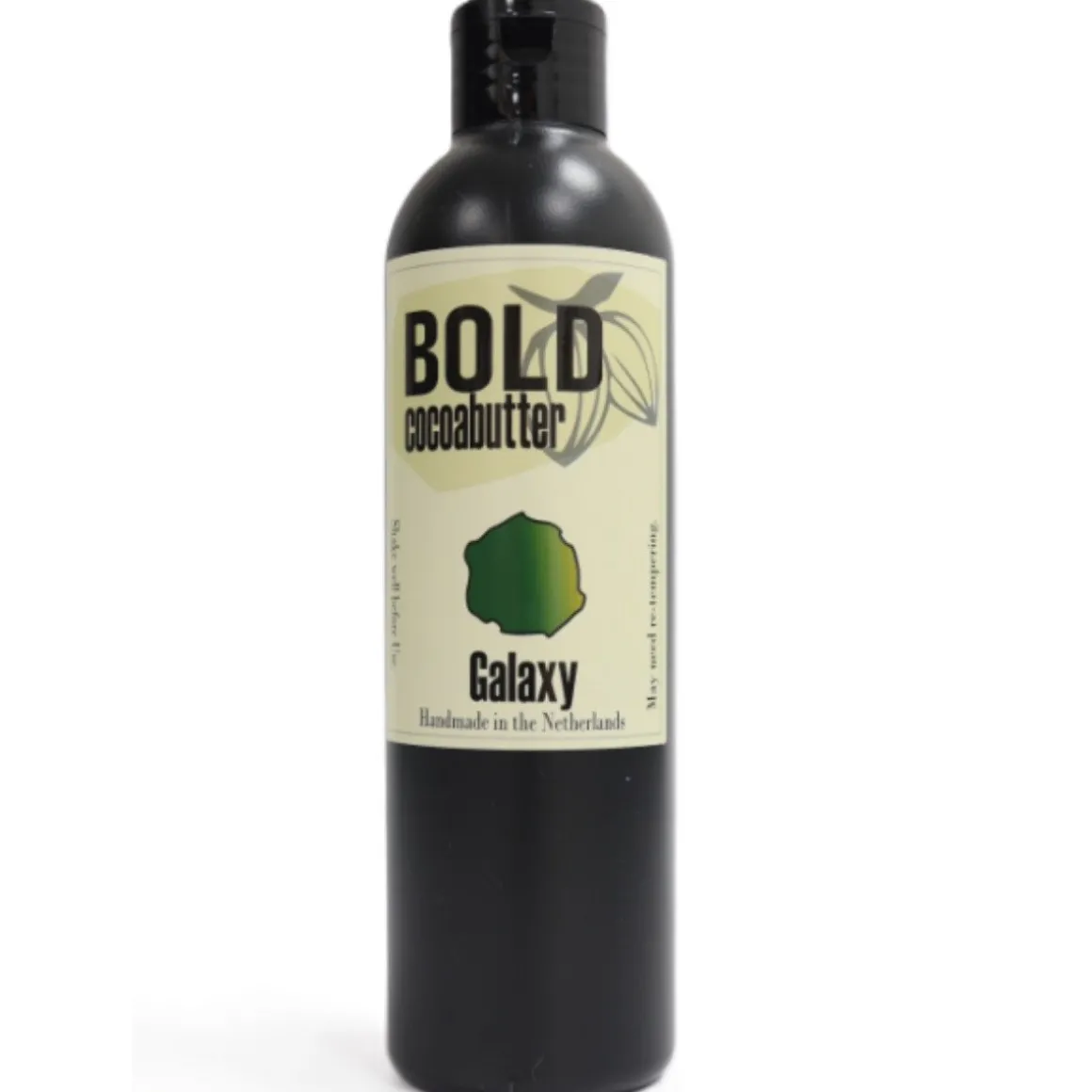 De Bold Cacaoboter Gekleurd Galaxy Glitter 230g heeft een mooie donkergroene kleur met gouden glitters erdoorheen. De gekleurde cacaoboter kan gebruikt worden voor het kleuren van verschillende soorten chocolade. De dekking is uitstekend, waardoor de kleur bij zowel witte als pure chocolade hetzelfde uitkomt. Het flesje bevat 230 gram gekleurde cacaoboter. Op Baktotaal.nl zijn meerdere kleuren gekleurde cacaoboter van het merk Bold verkrijgbaar.