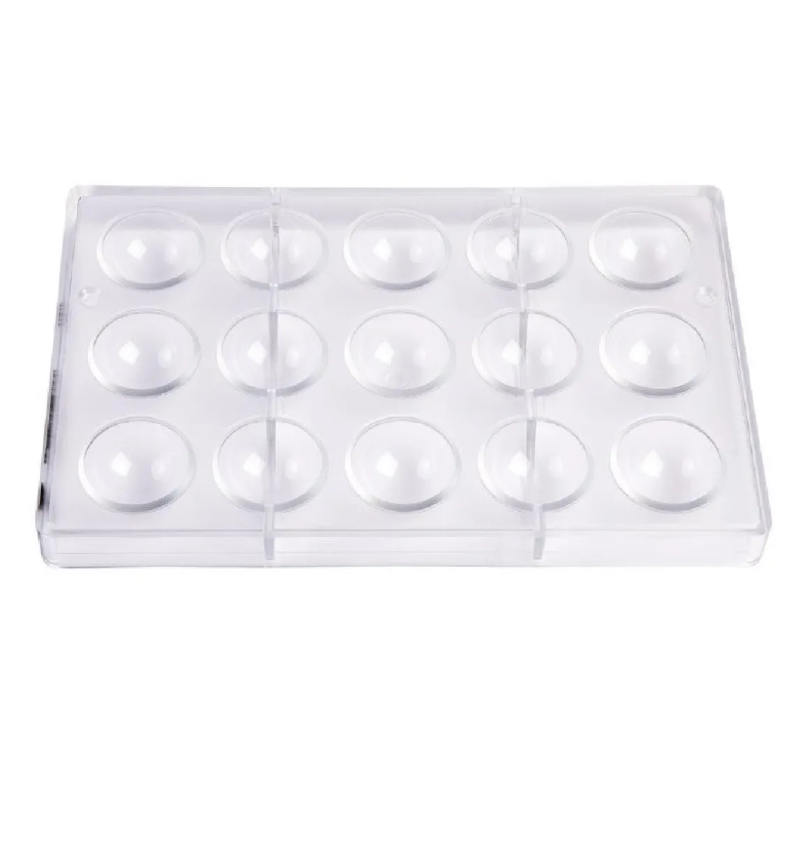 Met de Bonbonvorm Chocolate World Halve Bol (15x) Ø38x19mm kun je elke keer 15 halve bolletjes van chocolade maken. Deze bolletjes kun je eventueel tegen elkaar aan plakken, door de platte kanten wat warm te maken en tegen elkaar aan te drukken. Dan krijg je een hele bol. Uiteraard kun je het ook gewoon zo laten. Deze bonbonvorm is gemaakt van hoogwaardige kwaliteit polycarbonaat.