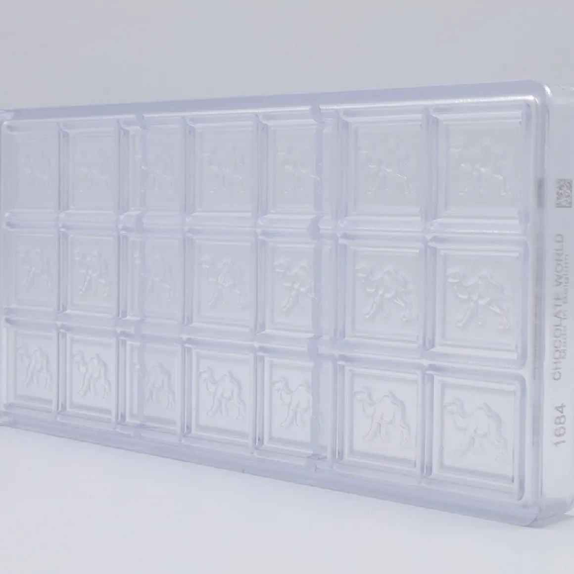 De Bonbonvorm Chocolate World Karak Kameel (21x) 34x34x4,5mm is perfect voor het maken van vierkante chocolaatjes. Deze vierkante holtes zijn versierd met een kameel en ideaal om chocolaatjes in verschillende smaken te creëren. Elke chocolaatje wordt circa 3,4 bij 3,4 centimeter groot.