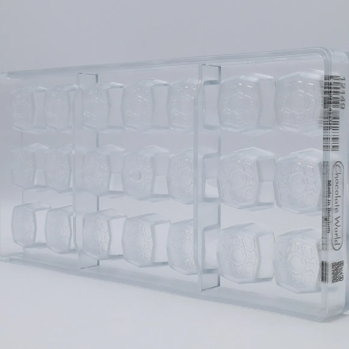 Elke bonbon heeft een afmeting van 2,8 bij 2,8 centimeter met een hoogte van 1,5 centimeter. De vorm bevat 21 achthoekige holtes.