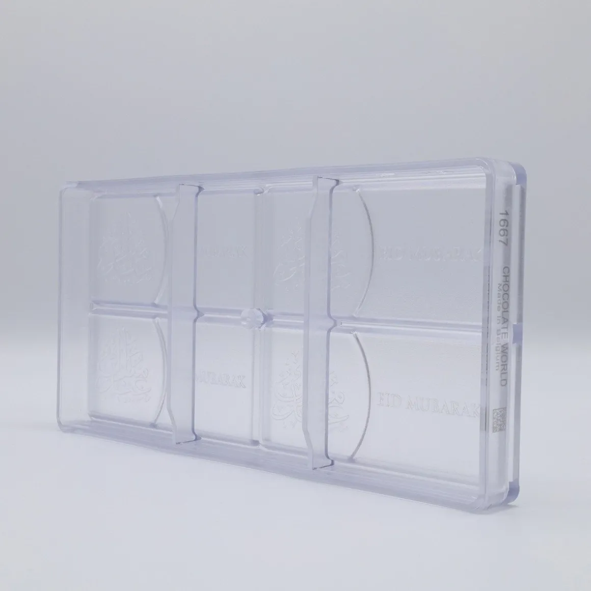 Deze rechthoekige repen zijn gedecoreerd met Eid Mubarak. Perfect voor lekkernijen tijdens het Offer- of Suikerfeest. Gebruik de mal voor pure, melk- en witte chocolade. Bovendien ook heerlijk om de chocolade te mengen met noten of gedroogd fruit.