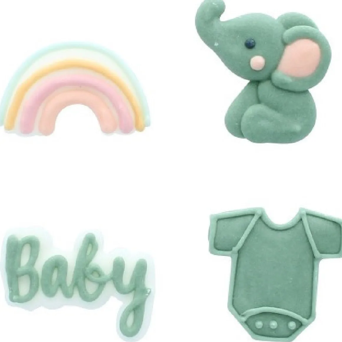 De set heeft 4 verschillende decoraties, een olifant, een regenboog, een rompertje en de laatste heeft de tekst ‘baby’. Totaal bevat de verpakking 12 decoraties, van elke variatie zitten er 3 stuks in. Deze hebben een doorsnede van ongeveer 2,5 centimeter.