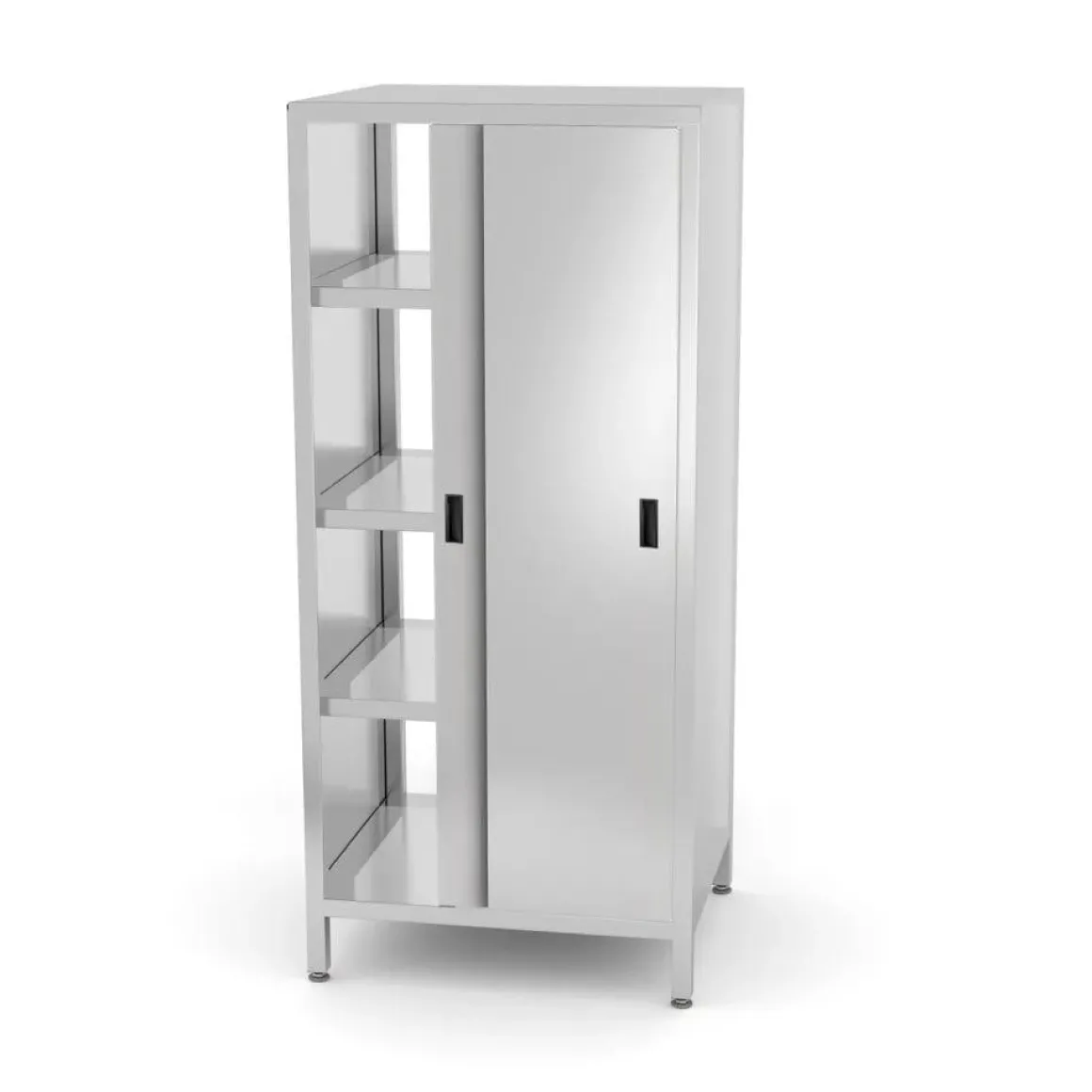 Deze uitvoering is vervaardigd uit Gemaakt van duurzaam roestvast staal (AISI 430). Uitgerust met 2 verwijderbare (niet verstelbaar), en 2 vaste schappen (onderste en middelste schap). Uitgerust met 4 schuifdeuren met verticale handgreep, allemaal op rollagers. De poten zijn in hoogte verstelbaar (-5/+25 mm) om waterpas plaatsing te garanderen. Platte levering, moet worden gemonteerd.