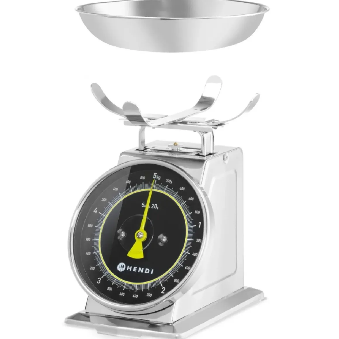 De Hendi Mechanische Keukenweegschaal 5 kg is een robuuste en gebruiksvriendelijke weegschaal met een klassieke uitstraling. De schaal is volledig uitgevoerd in RVS. De grote, goed afleesbare wijzerplaat geeft het gewicht aan in stappen van 20 gram en heeft een maximale capaciteit van 5 kg. De afneembare weegschaalkom maakt het eenvoudig om ingrediënten te wegen én schoon te maken na gebruik.