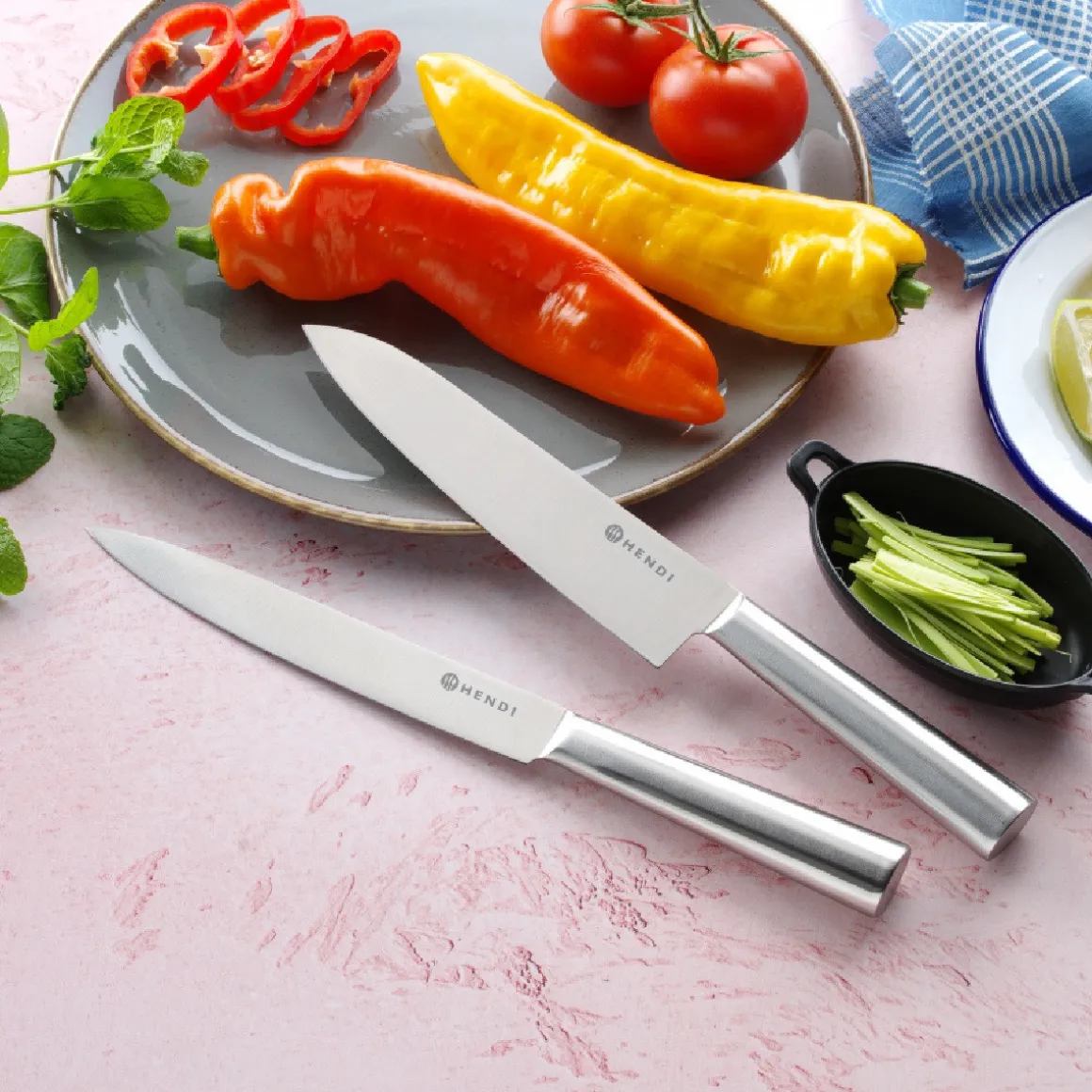 De Hendi Messenset Set/4 is een praktische set met 2 koksmessen, een vleesmes en een schilmes. Perfect voor uiteenlopende snijtaken tijdens het koken én bakken. Of je nu appels in dunne plakjes wilt snijden voor een appeltaart, noten fijnhakt voor koekjes of chocolade in stukjes breekt voor muffins, met deze set heb je altijd het uiste mes bij de hand.