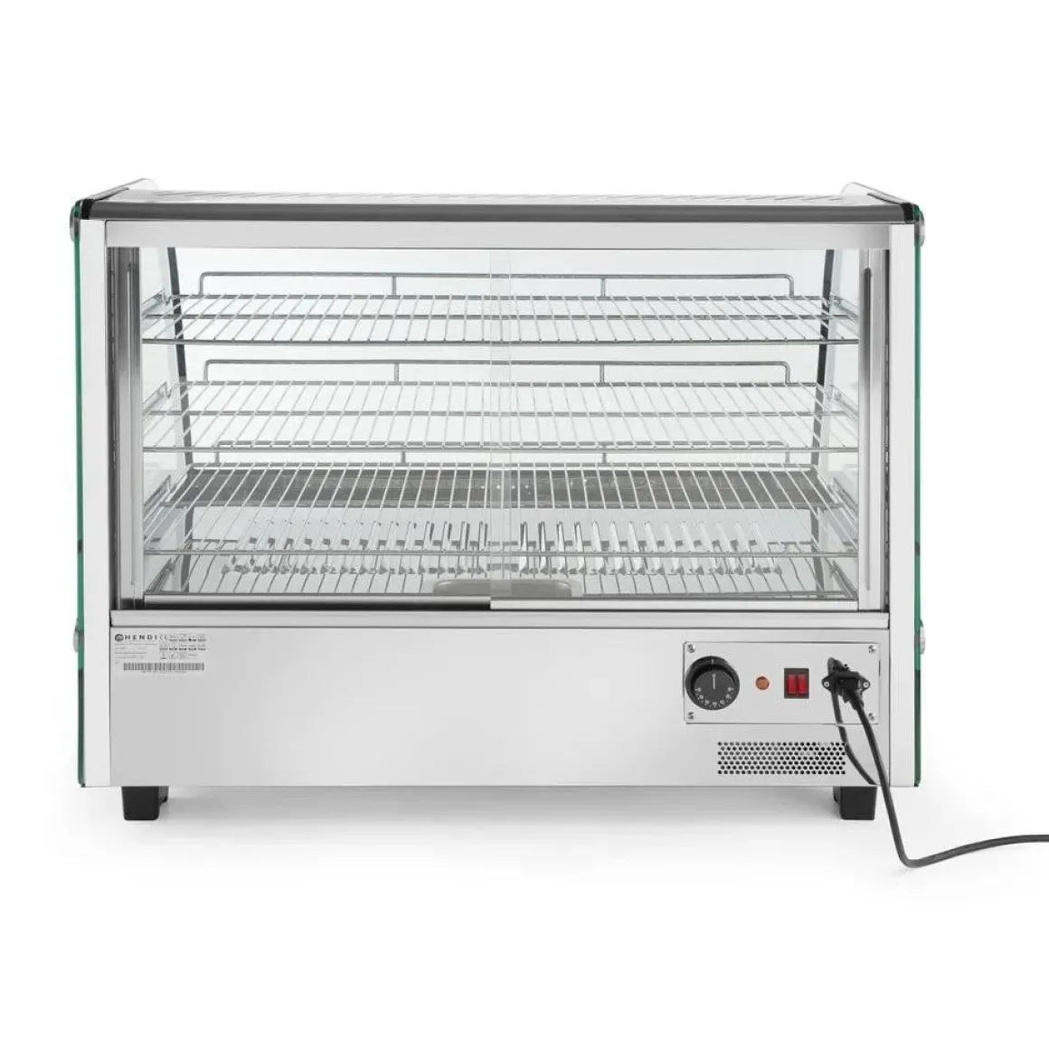 Uitgerust met enkele beglazing en gebogen glas aan de voorkant. Drie niveaus. Twee schuifdeuren aan de achterkant. Deze uitvoering is vervaardigd uit Gemaakt van roestvast staal. LED-lampje aan de bovenkant van de kamer. Met 3 verchroomde verstelbare planken. Temperatuurregelknop en analoge thermometer. Temperatuurbereik: 30°-90°C.