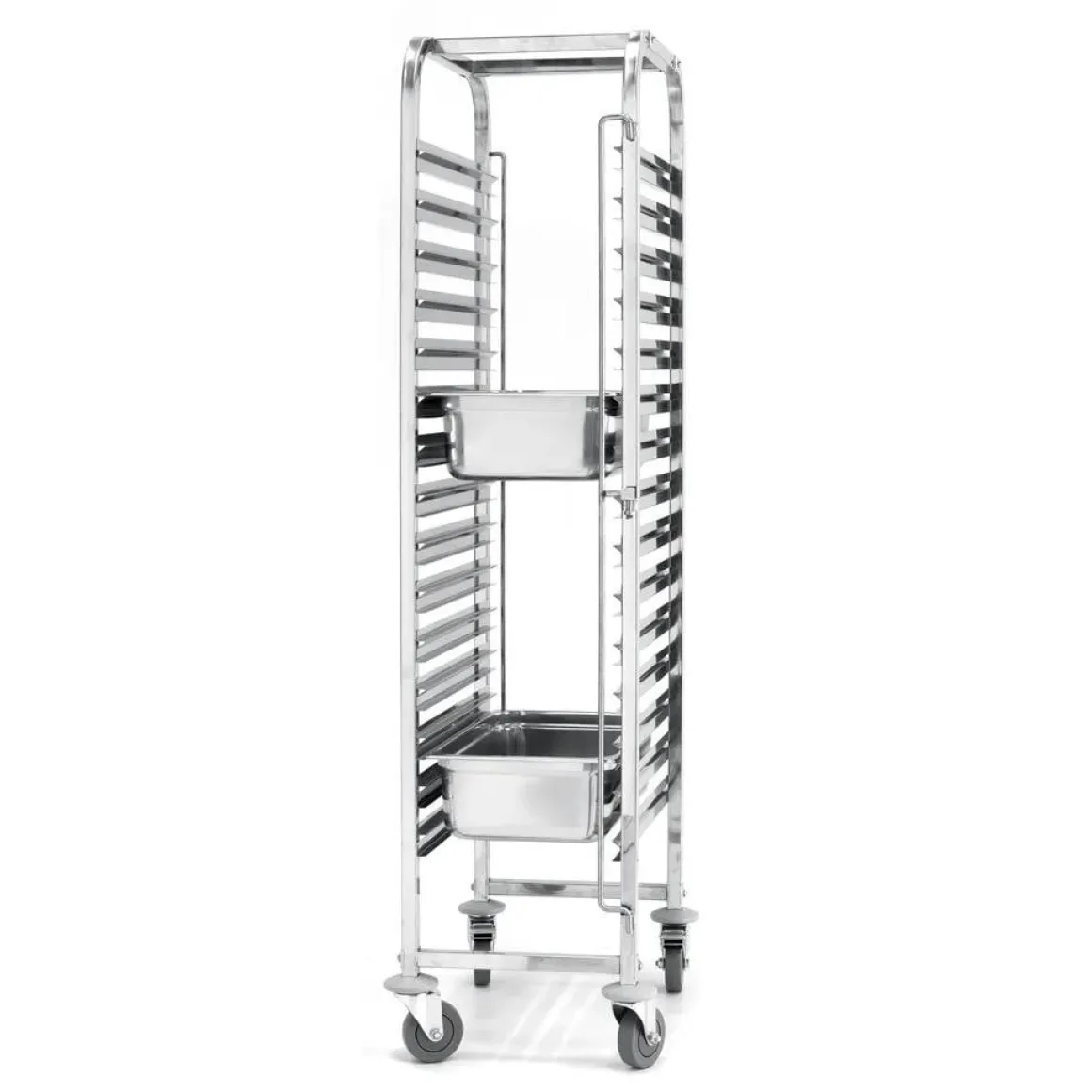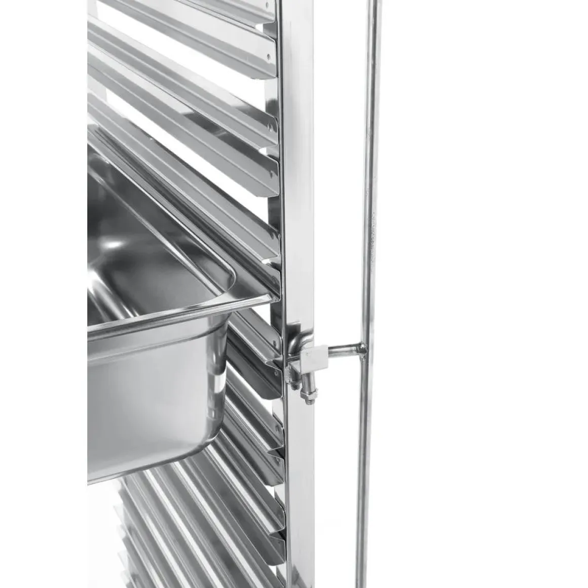 GN 1/1 met 15 etages – tussenruimte 80 mm. Met aan beide zijden een vergrendeling voor de plateau’s. Voorzien van 4 zwenkwielen waarvan 2 geremd. Wordt gedemonteerd geleverd.