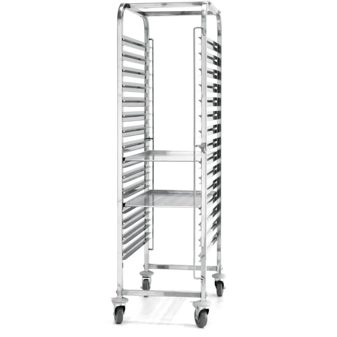 600×400 mm met 15 etages – tussenruimte 80 mm. Aan beide zijden een vergrendeling voor de plateau’s. Voorzien van 4 zwenkwielen waarvan 2 geremd. Maximale belasting is 150 kg bij gelijkmatige verdeling. Wordt gedemonteerd geleverd.