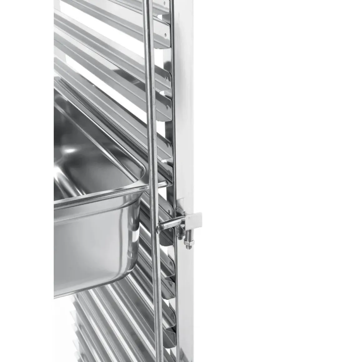 Dankzij het doordachte ontwerp is dit apparaat uitermate geschikt voor Ontworpen voor GN 1/1 dienbladen/bakken – tussenruimte 80 mm. Met werkoppervlak. Aan beide zijden een vergrendeling voor de plateau’s Voorzien van 4 zwenkwielen waarvan 2 geremd. GN 1/1 – 530×325. Flatpack levering.