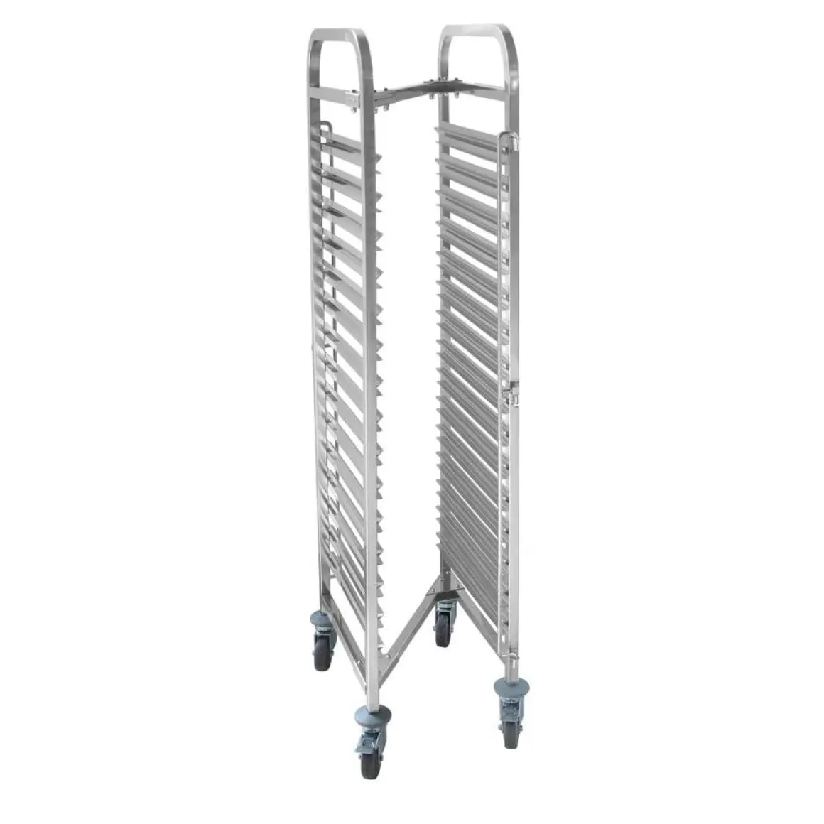 Om ruimte te besparen tijdens opslag kunnen trolleys in elkaar worden geschoven. GN 1/1 met 15 etages – tussenruimte 80 mm. Met aan beide zijden een vergrendeling voor de plateau’s. Voorzien van 4 zwenkwielen waarvan 2 geremd. Wordt gedemonteerd geleverd. Maximale belasting is 150 kg bij gelijkmatige verdeling.