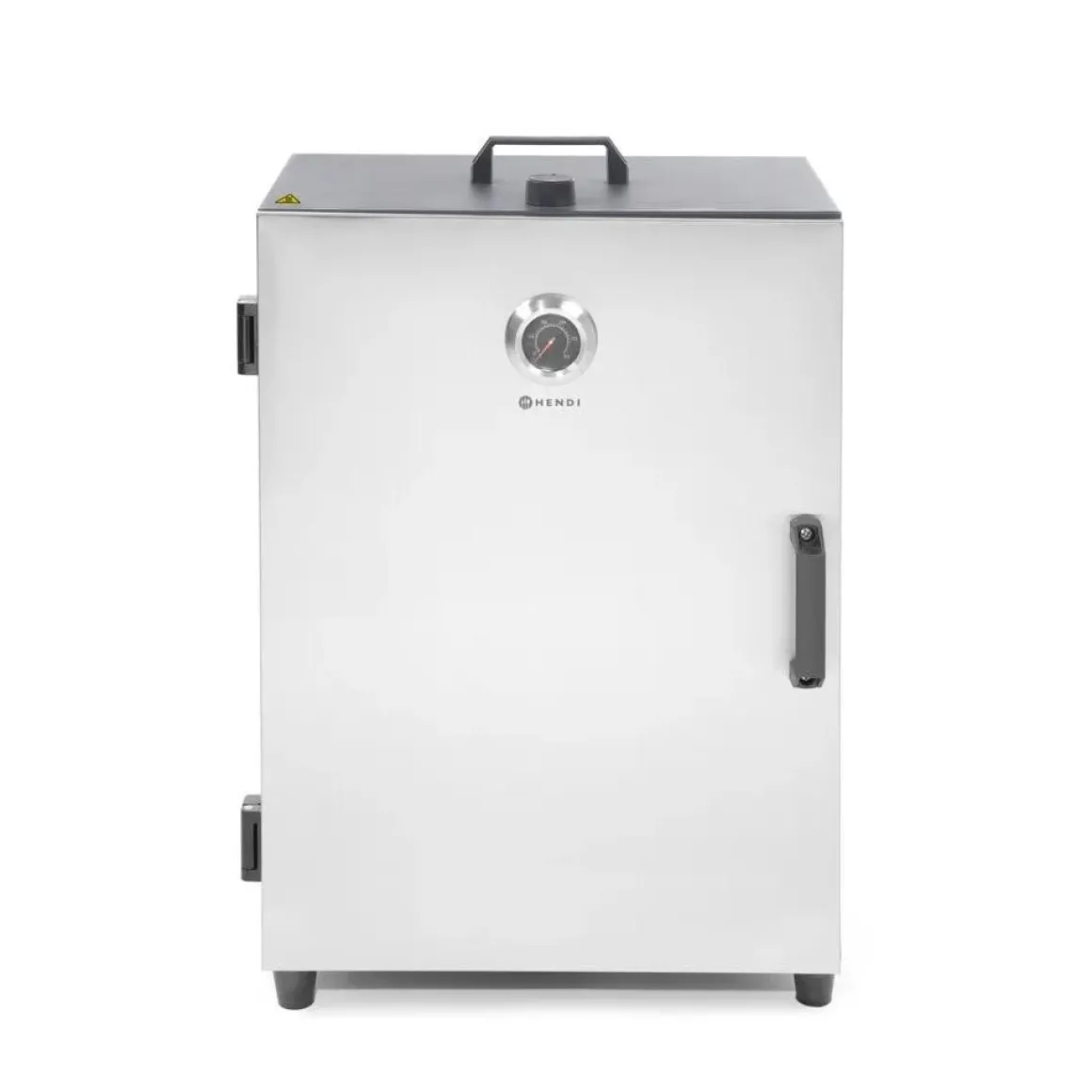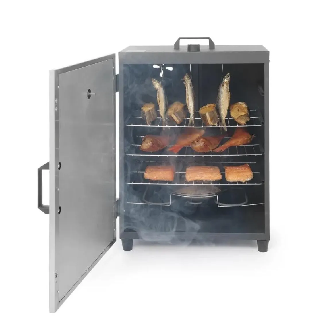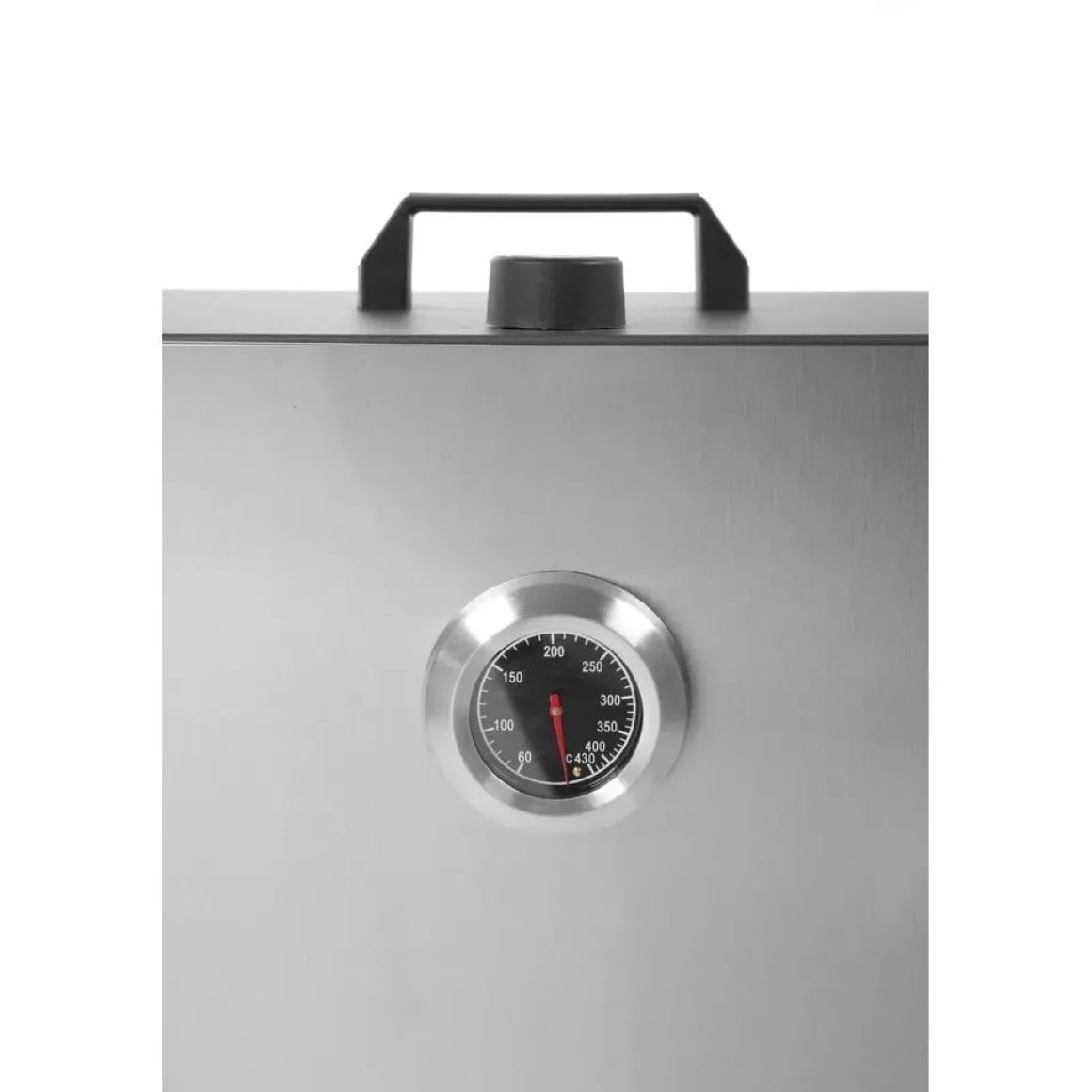 De rookoven is ideaal voor het roken en bereiden van vis, vlees, ham en groenten. Deze uitvoering is vervaardigd uit Gemaakt van roestvast staal met magnetisch sluitende dubbel geïsoleerde deur. Temperatuur in te stellen via een thermostaat, geïntegreerde thermometer in de deur. Voorzien van een ventilatieopening aan de achterzijde. Wordt geleverd met 3 stuks 400×279 mm roosters en beugel met 3 haken.