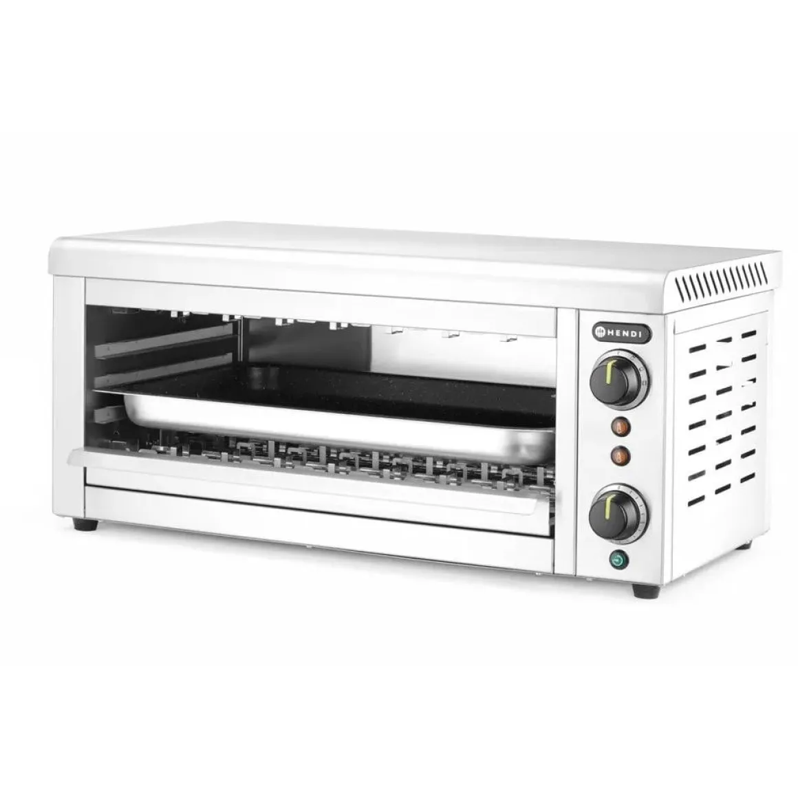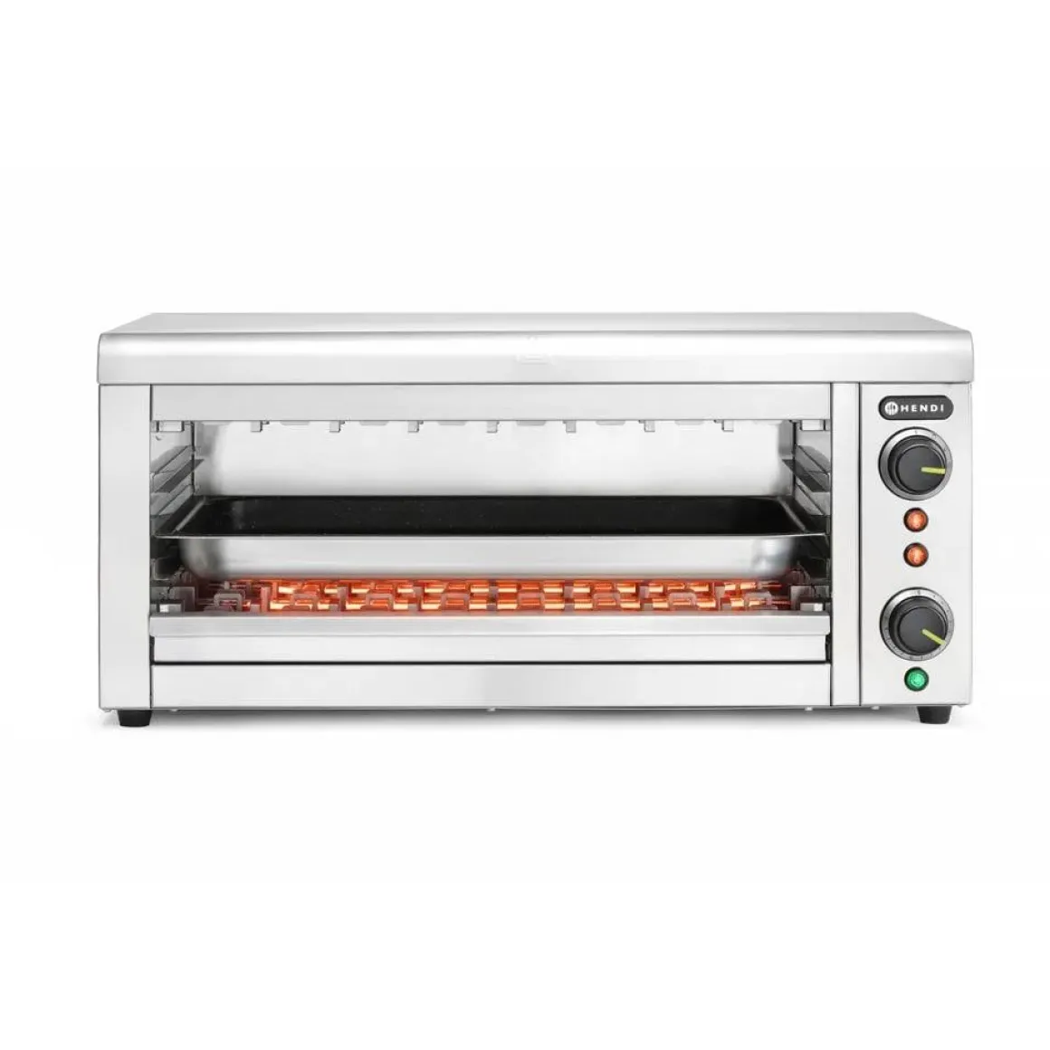 Het is mogelijk GN 1/1 trays in de kamer te plaatsen. Ideaal om mee te grillen of gerechten mee te verwarmen. Met Quartz infrarood verwarmingselement onder & boven. Voorzien van 15 minuten timer en controlelampjes. Rooster in 3 hoogtes verstelbaar en voorzien van hitteschild. Met kruimellade. Voldoet aan IPX3 norm.