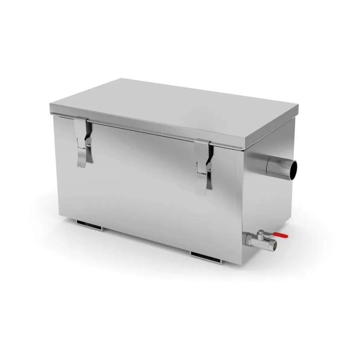 Voorkomt dat vet de riolering verstopt. Voor gebruik binnenshuis (afwasruimtes, keukens). Deze uitvoering is vervaardigd uit roestvast staal. Het deksel met pakking wordt op zijn plaats gehouden met vier klemmen. Water aan- & afvoeraansluitingen Ø50 mm. Twee verticale binnenschotten scheiden het vet en slib. Vetafvoer uitgerust met van een kogelkraan.
