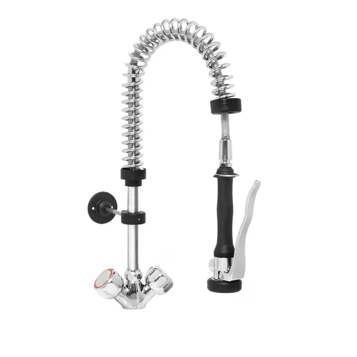 Monobloc voorspoeldouche. Uitermate geschikt om te gebruiken bij water onder hoge druk. Maximale waterstroom: 17 L / min. Bij een druk van 4 bar. Kunststof spoelhandvat. Verstelbare kolomsteun. Wandmontage (optioneel inkorten). Aansluitslangen: 1/2”, elk 400 mm lang. Ø27 mm tafelgat vereist.