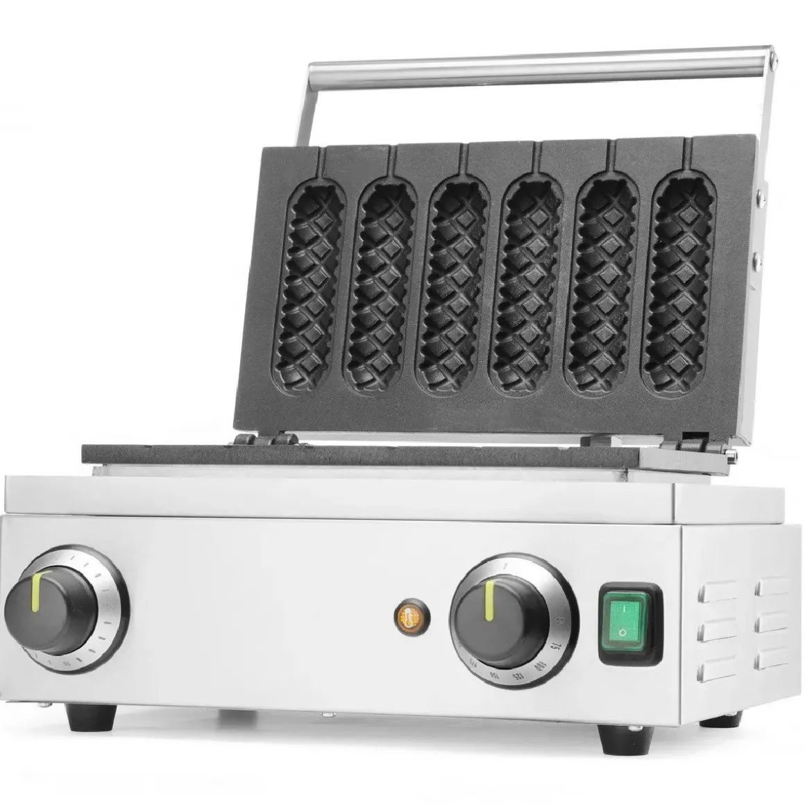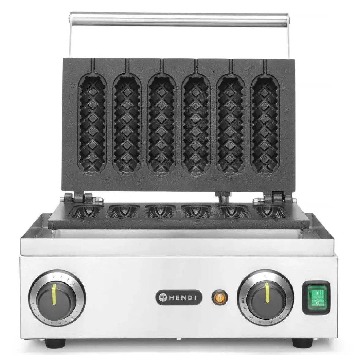 Met het Hendi Wafelijzer Corndog/Lollypop maak je heerlijke corndogs of wafels op een stokje. Met dit apparaat kun je 6 corndogs of wafels tegelijk bakken. Er zitten groeven in het ijzer waar het stokje in kan, ook als het ijzer is gesloten. De buitenkant is van roestvrijstaal, waardoor het apparaat een lange levensduur heeft en makkelijk schoon te maken is. We raden aan om dit apparaat met een borstel te reinigen.
