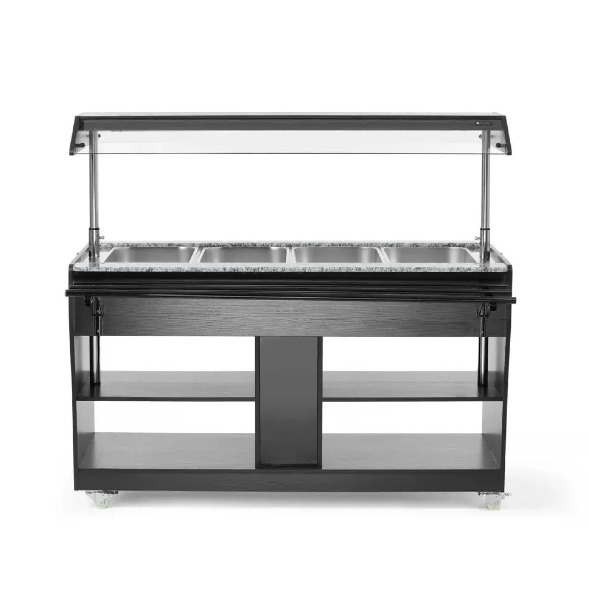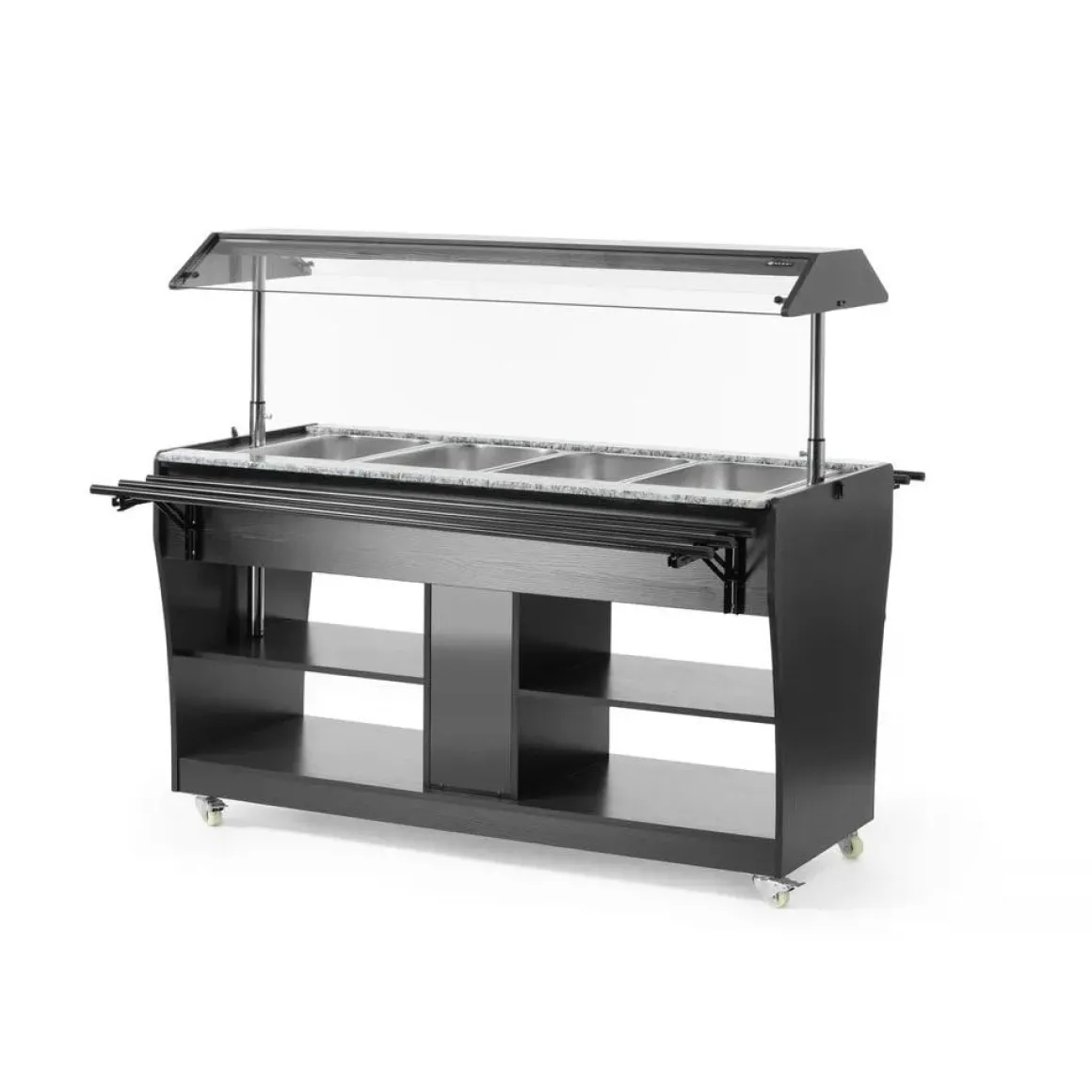 Deze uitvoering is vervaardigd uit roestvast staal met zwart multiplex. Uitermate geschikt om te gebruiken bij 4 GN 1/1 containers – max. 150 mm diep. Geleverd met 4 GN 1/1 containers. Uitgerust met een lampje in de kap. De luifel kan worden neergelaten om als afdekking te fungeren, vastgezet met vergrendelingen. Inklapbare traygeleiders aan beide zijden. 2 planken onder de toonbank. Uitgerust met 4 zwenkwielen. Temperatuur instelbaar van 30°C tot 90°C.