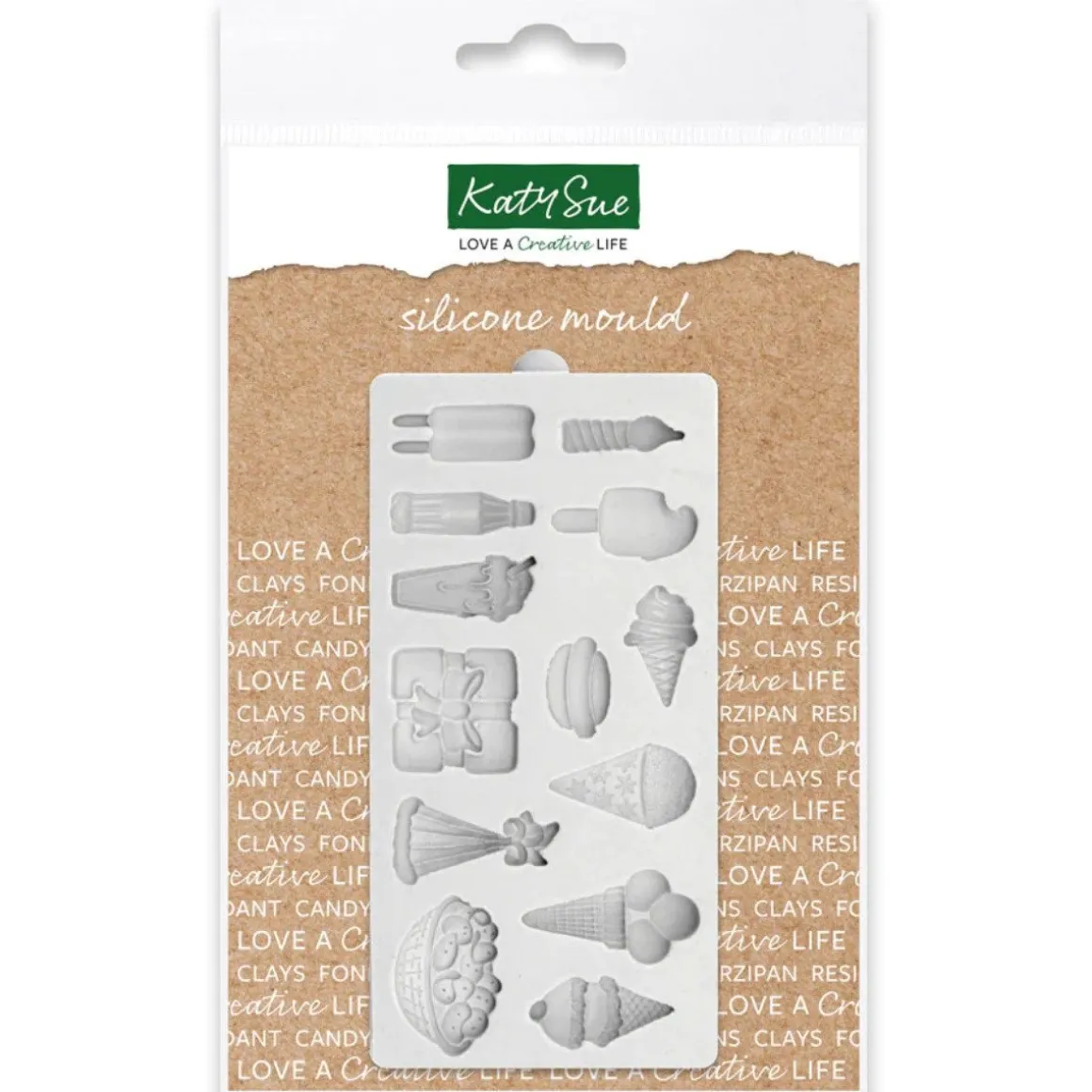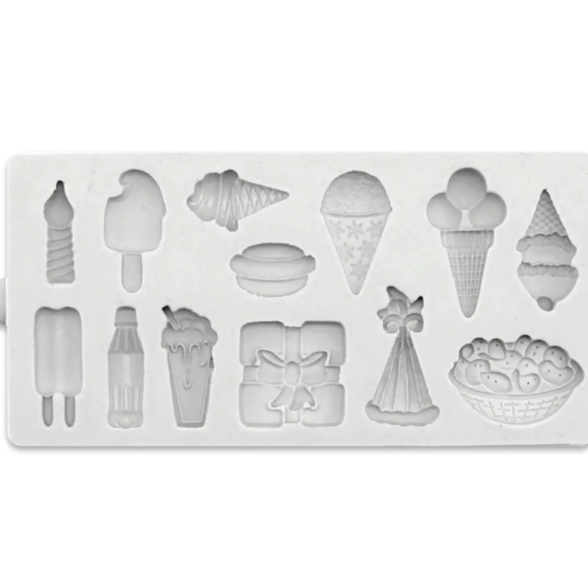 De Katy Sue Mold Party Time is een perfecte mold om te gebruiken om decoraties voor een feestje te maken. Met deze mold kun je verschillende decoraties maken van bijvoorbeeld chocolade of fondant. Er zitten onder andere figuren van ijsco’s, cadeaus, chips en drinken in. In totaal kun je 13 verschillende figuren maken.