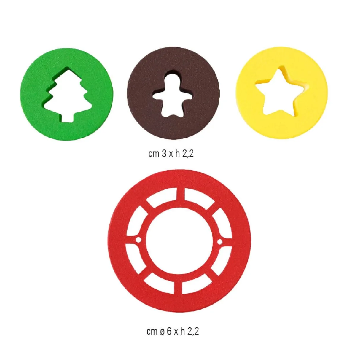 - De set bevat in totaal vier figuren (een ronde vorm, een denneboom, gingerbread pop en ster)
