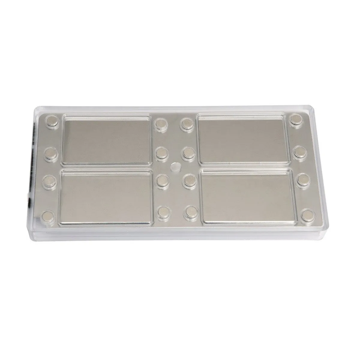 Met deze magneet bonbonvorm kun je je eigen logo’s of prints op bonbons aanbrengen. Het werkt eenvoudig: Print je ontwerp d.m.v. het chocolate artist programma op een chocoprint bonbonformaat sheet, klem deze in de magneet bonbonvorm, vul deze met chocolade en een lekkere vulling en het resultaat wordt prachtig!