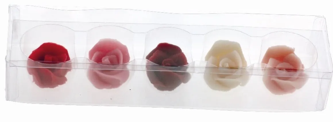 In deze blister zitten vijf marsepeinen rozen in vijf verschillende kleuren. Van zacht roze tot diep rood. Ideaal om je patisserie mee te verfraaien. Maar ook vooral geschikt om bruidstaarten mee te decoreren. De rozen hebben een diameter van ongeveer 4 cm.
