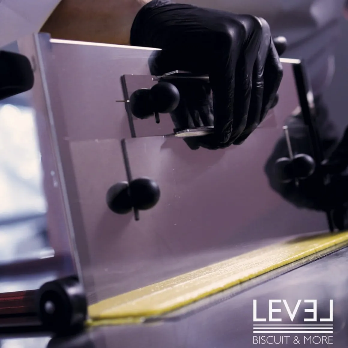 4. Trek het guillotinesysteem omhoog en laat de trekbak over de gekozen ondergrond lopen waarmee je een mooie, gelijkmatige laag beslag achterlaat. (bijvoorbeeld op een siliconen bakmat of bakpapier).