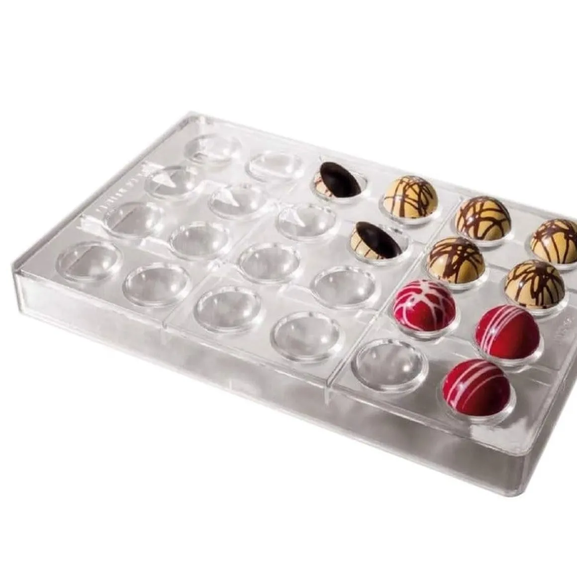 Deze bonbonvormen zijn heel leuk om kleine bonbons mee te maken. De bonbons hebben een doorsnede van 3 cm. Met 1 mal kan je 24 halve rondjes maken. Deze bonbonmal is gemaakt van het zeer sterke materiaal polycarbonaat. Elke bonbon heeft een gewicht van ongeveer 4 gram.