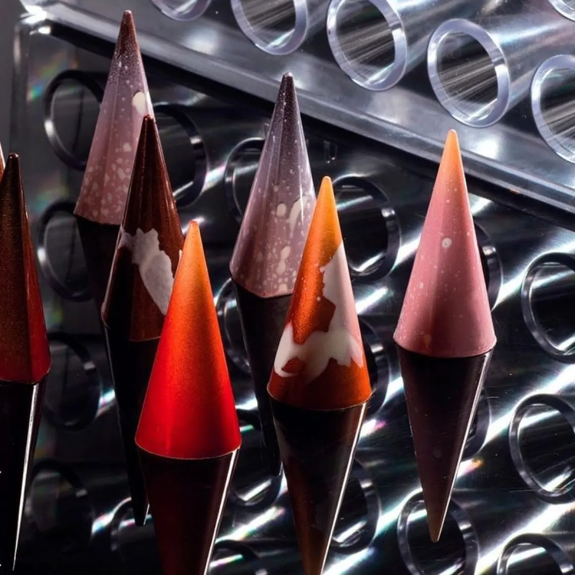 Met deze prachtige bonbonvorm maak je de mooiste kegelvormige bonbons. Met deze vorm kun je 28 bonbons tegelijk maken en per bonbon hebben ze een afmeting van 25x25x55mm. Elke bonbon heeft een gewicht van ongeveer 11g. De vorm is gemaakt van een sterk polycarbonaat en heeft een afmeting van 275x175mm.