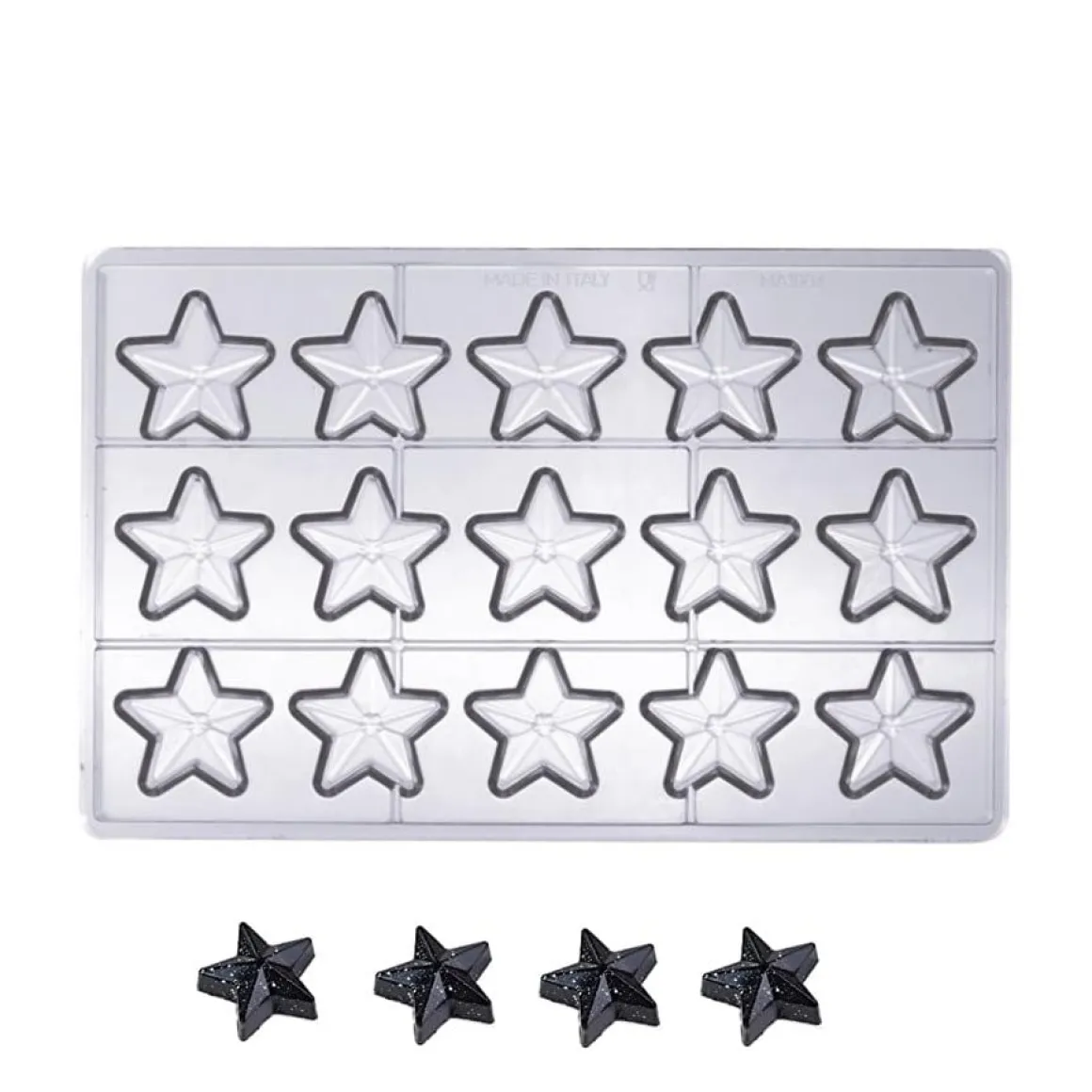 Als er iets is wat altijd leuk blijft zijn dat sterretje. Je kunt er zoveel verschillende creaties mee maken. Met deze bonbonvorm kun je 15 chocolade sterretjes maken van 40x42x16mm per stuk. Elk sterretje weegt ongeveer 10g. De vorm is gemaakt van een sterk polycarbonaat.