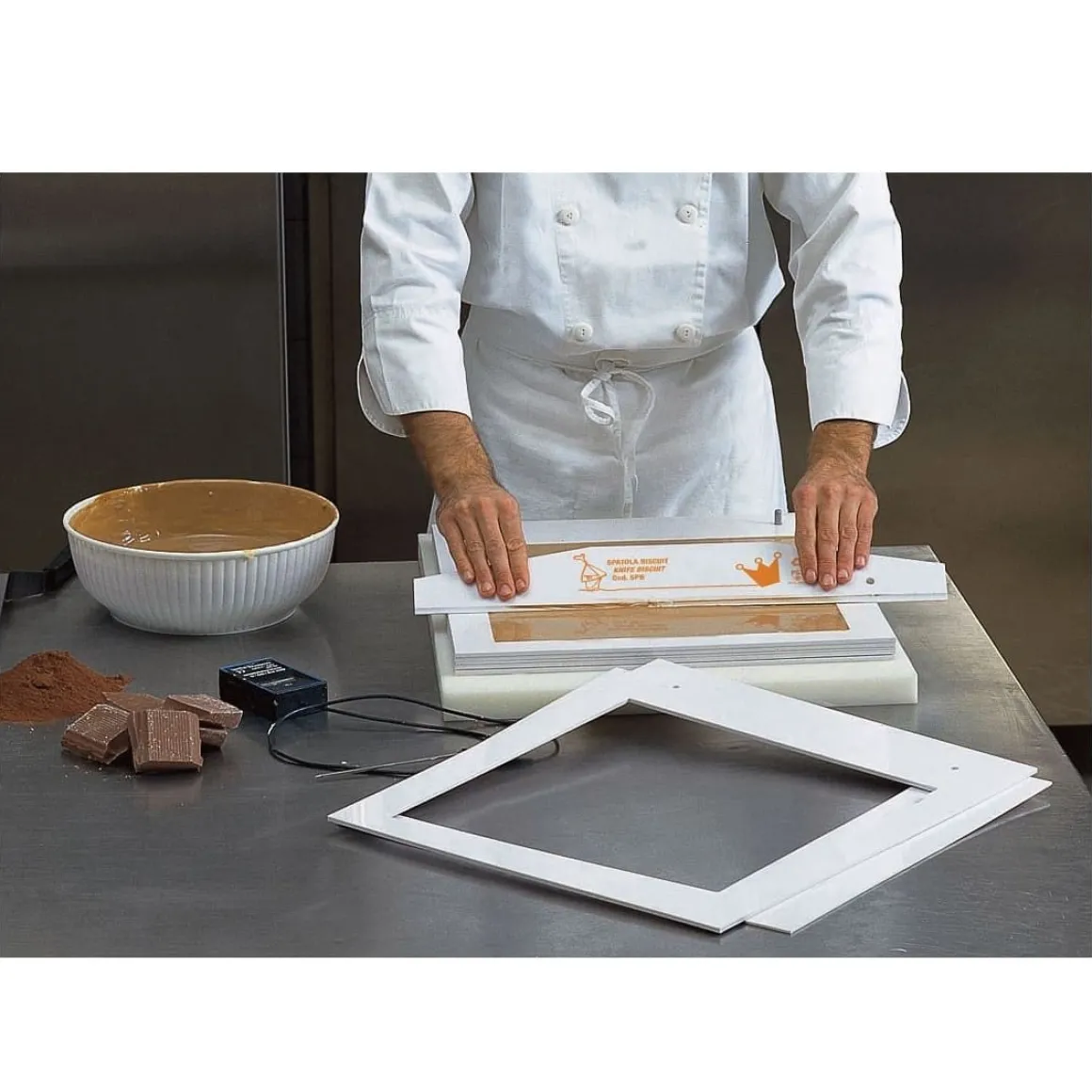 Frame van het merk Martellato om handmatig kapsel/biscuit mee te ’trekken’ door middel van een krabber. Met dit frame krijg je een exacte biscuitplak van 57x37cm met een dikte van 3 mm.