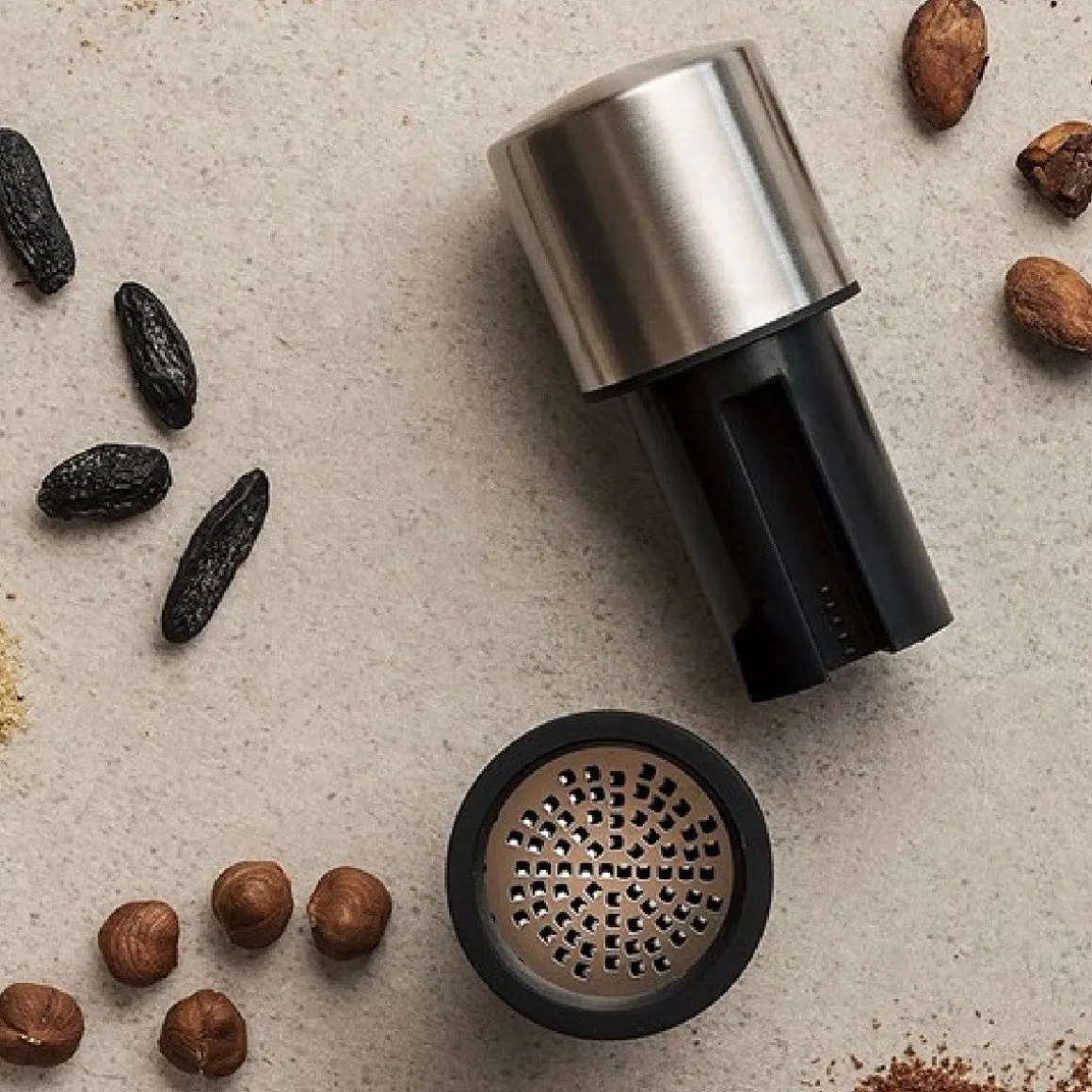 Met de Microplane Nootmuskaatmolen kun je eenvoudig nootmuskaat en andere specerijen fijnmalen. De molen bestaat uit twee delen. Haal deze van elkaar af en plaats de nootmuskaat hierin. Doe het bovenste gedeelte erop en draai met de klok mee om de specerij fijn te malen. Naast nootmuskaat kan deze ook gebruikt worden voor andere harde specerijen, zoals kaneel.