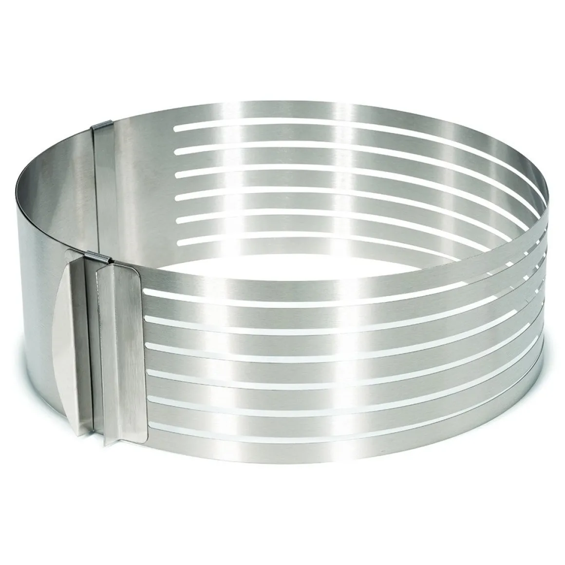 Deze ring is geschikt voor taarten van 24 tot 30 cm. Met deze taartring word het snijden van een taart kinderspel. Het enige wat er moet gebeuren is de ring om de gebakken taart schuiven en hem op maat maken. Als dit gebeurt is kun je met een goed scherp mes door de gleuven rond snijden en zo krijg je gelijkmatige plakken taart. De ring is gemaakt van roestvrijstaal.