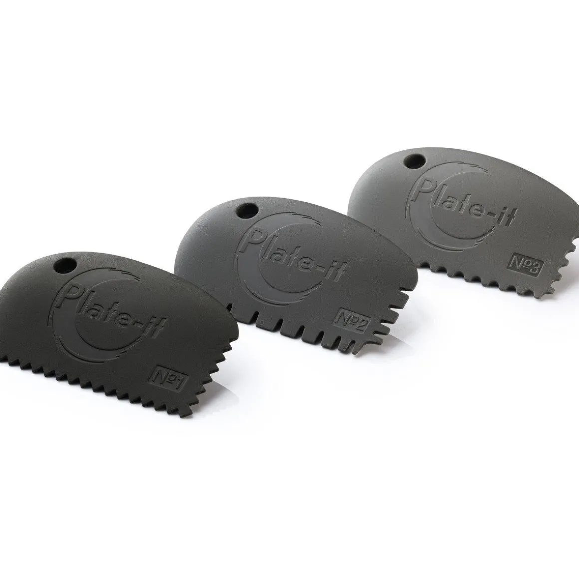 Plate-It Decoratie Schrapers Set/3 bestaat uit 3 schrapers die je perfect kunt gebruiken voor het maskeren van een taart. Met de schrapers kun je ook eenvoudig deeg, beslag en dergelijke uit een kom halen, zodat er zo weinig mogelijk product wordt verspild.