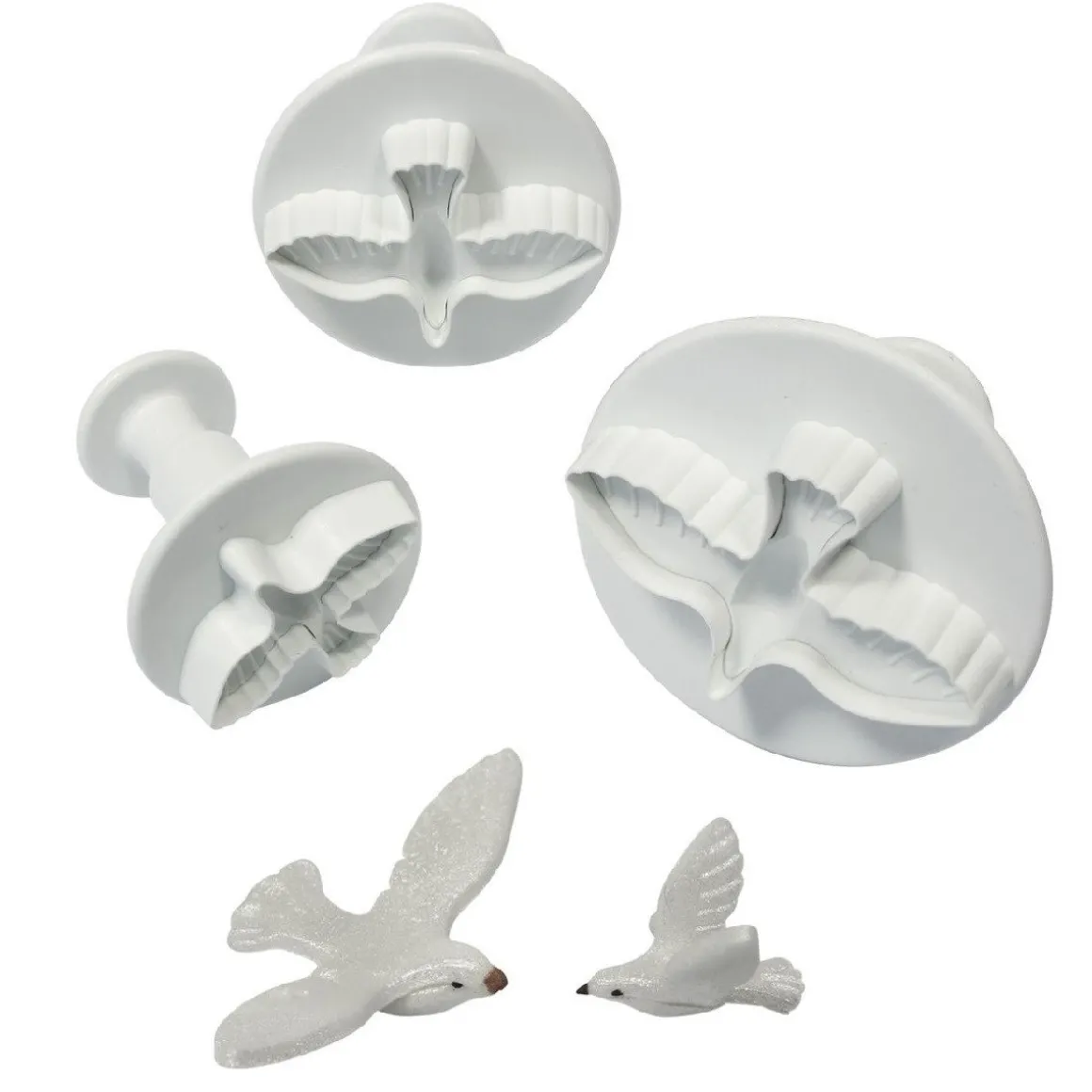 De PME Plunger Cutter Duiven Set/3 bestaat uit 3 plunger cutters in verschillende formaten. Met deze plunger cutters kun je duiven uit onder andere fondant steken. Doordat de uitstekers een handig uitdruksysteem hebben krijg je een mooi reliëf in hetgeen waarin je de uitstekers drukt.