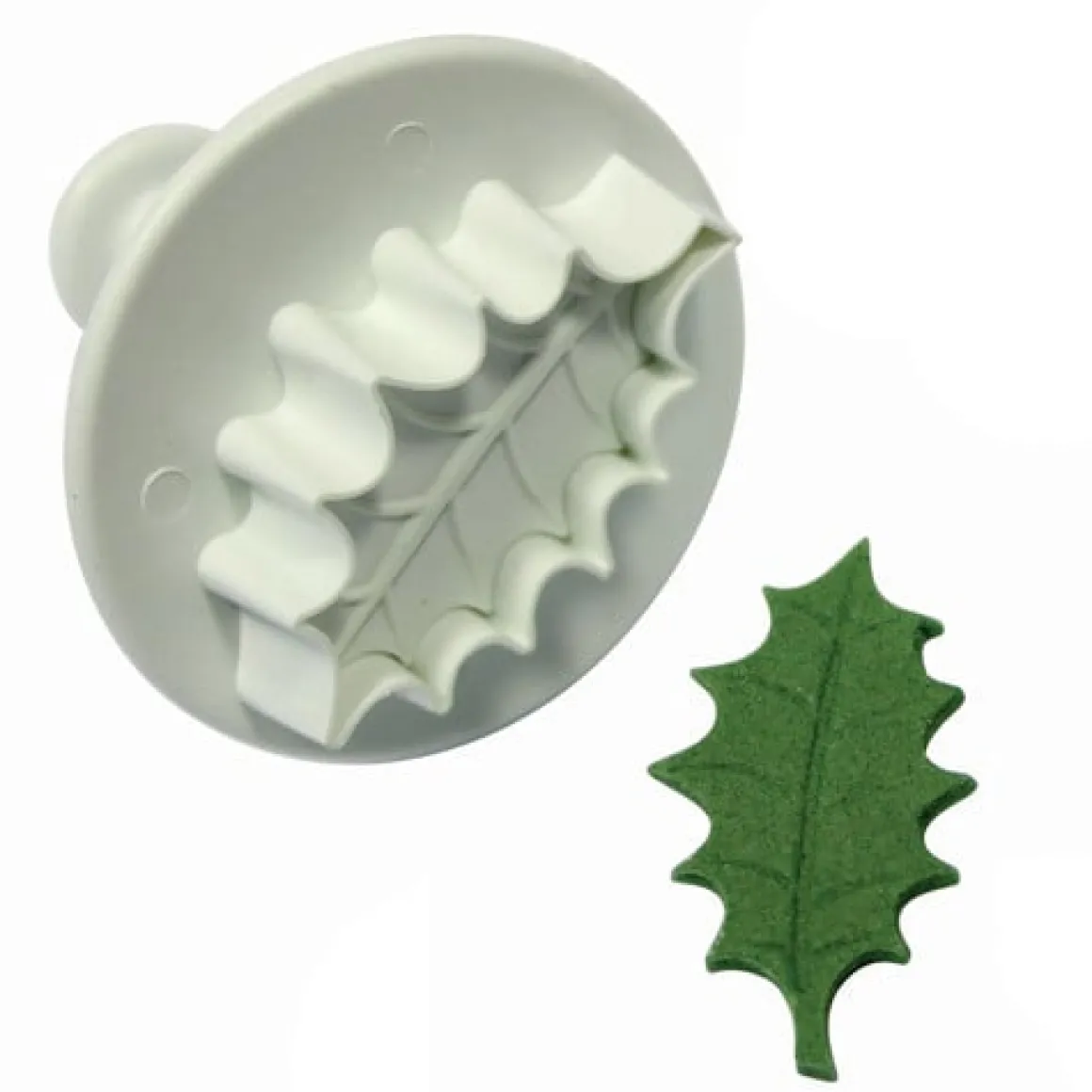 Kunststof plunger cutter voor het uitsteken en van een hulstblad met echte nerven. Probeer dit product in combinatie met onze groene fondant en/of marspein!