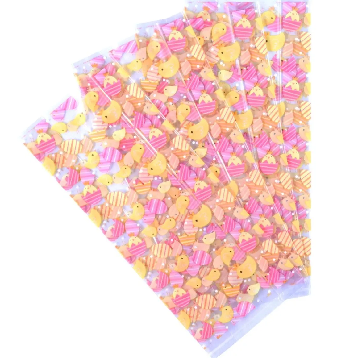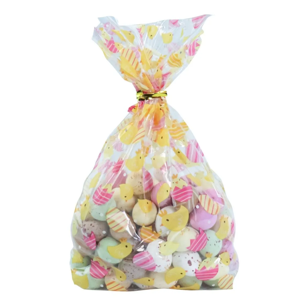 De PME Traktatiezakjes Paaskuikens 20st zijn transparante zakken met daarop versieringen van kuikens en eieren. Elke zak heeft een afmeting van 15,2 bij 24,1 centimeter en de verpakking bevat 20 stuks. Bovendien worden de zakken geleverd met sluitclips.