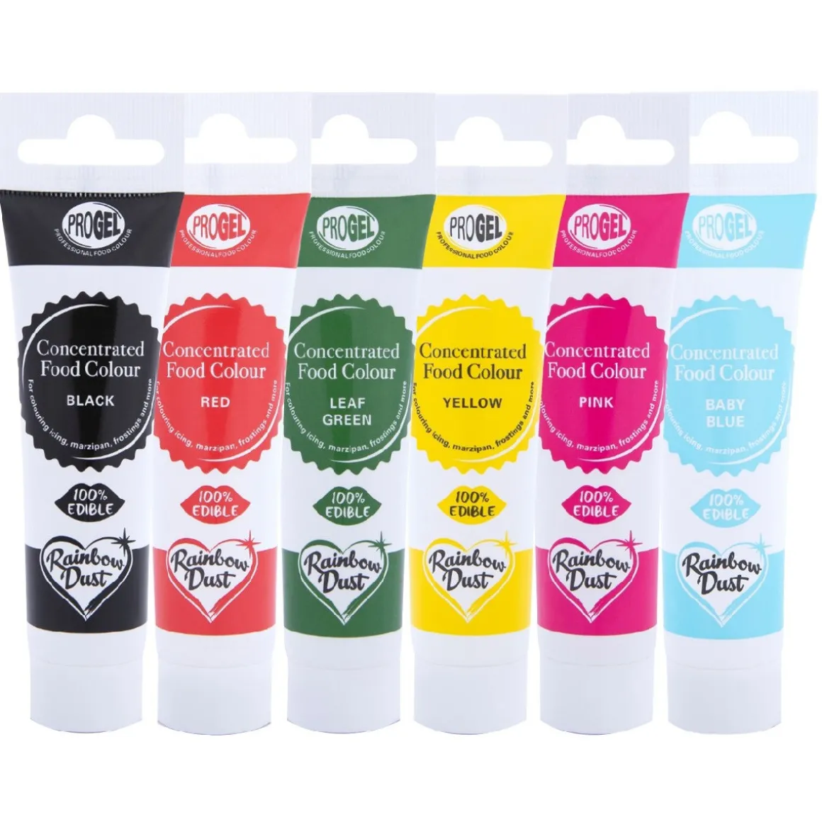 Heb je zin in een vrolijk kleurtje, voeg dan wat ProGel kleurstof van het merk Rainbow Dust toe. Met deze gel verander je een saaie witte fondant/marsepein in een zwarte , rode, groene, roze, gele of blauwe botercrème/fondant/marsepein. De tubes gaan lang mee, doordat je maar een kleine hoeveelheid kleurstof nodig hebt om je creaties een diepe en rijke kleur te geven. De kleurstof ik ook geschikt om biscuitdeeg of ander deeg een mooie kleur te geven.
