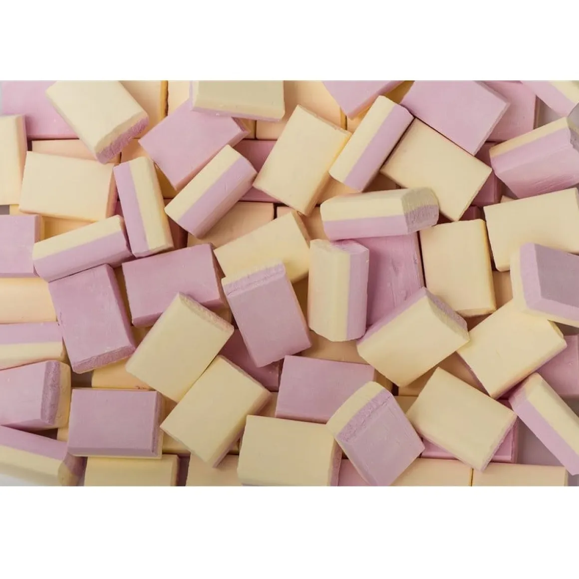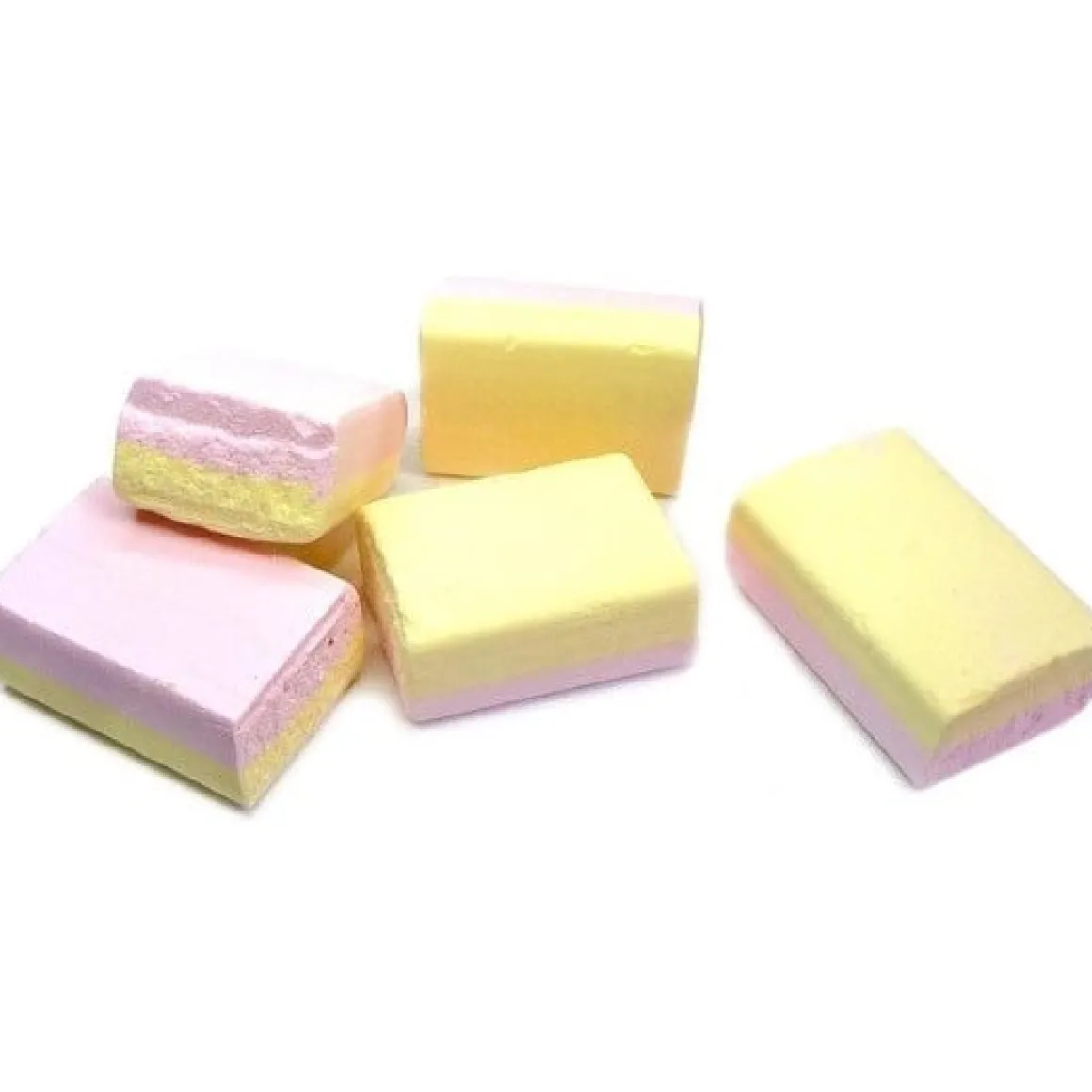 Heerlijke schuimblokken met een lichte vanille smaak herkenbaar om hun roze/gele kleuren en zoete geur. Deze schuimblokken zijn bros en smelten weg op je tong, perfect om uit te delen op een feestje of te gebruiken als decoratie op snoeptaarten/cupcakes.