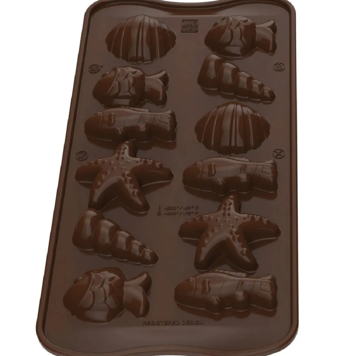 Met de Silikomart Siliconen Bonbonvorm Zeevruchten (12x) Ø3,5×1,6cm maak je chocolaatjes in de vorm van zeevruchten. De siliconen bonbonvorm bevat 12 holtes in onder andere een zeester, vis en schelp vorm.