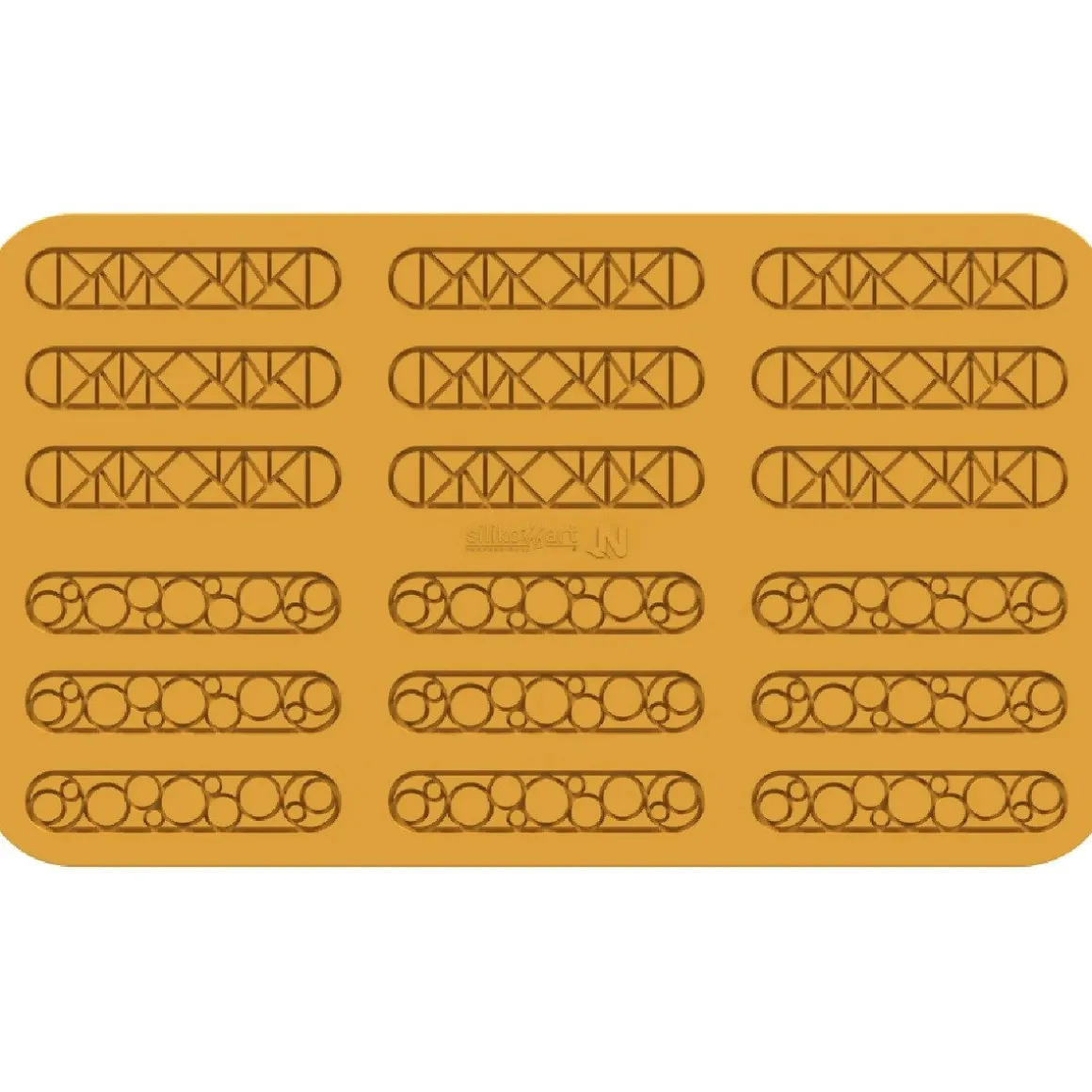 De Silikomart Siliconen Mat Lampo (18x) 13,1×2,6×0,2cm heeft holtes met 2 verschillende designs. Beiden hebben een langwerpige vorm met afgeronde hoeken. Binnenin is er een versierd met ronde vormen en de andere met driehoekige vormen.