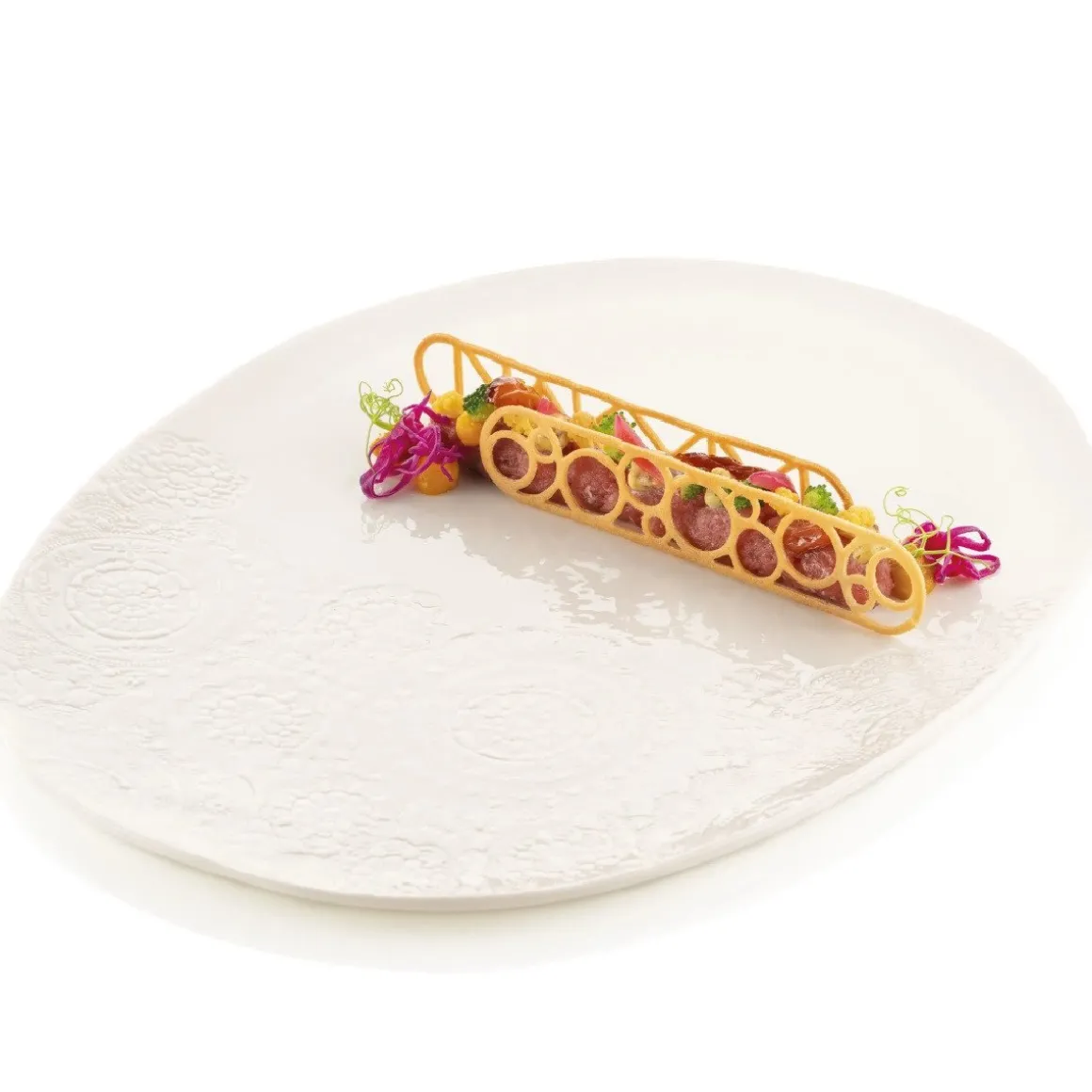 Geweldig om decoraties mee te creëren. Dit kun je bijvoorbeeld doen met chocolade of pâte à cigarette. Erg mooi om deze versiersels te gebruiken voor het afwerken van baksels, gerechten of desserts.