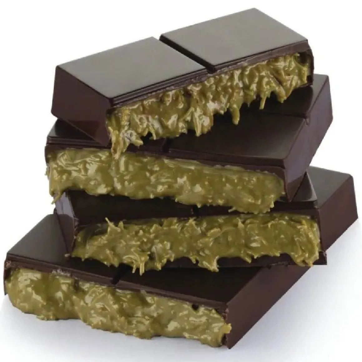 Met de Silikomart Siliconen Tablet Vorm Dubai (10 vaks) 15,5×7,5×5,5cm maak je zelf de populaire Dubai reep! De Dubai reep is een heerlijke chocoladereep gevuld met pistachecrème en kadayif. Deze vorm heeft een dikte van 1,5 centimeter, waardoor deze ideaal is voor het creëren van een goed gevulde chocoladereep.