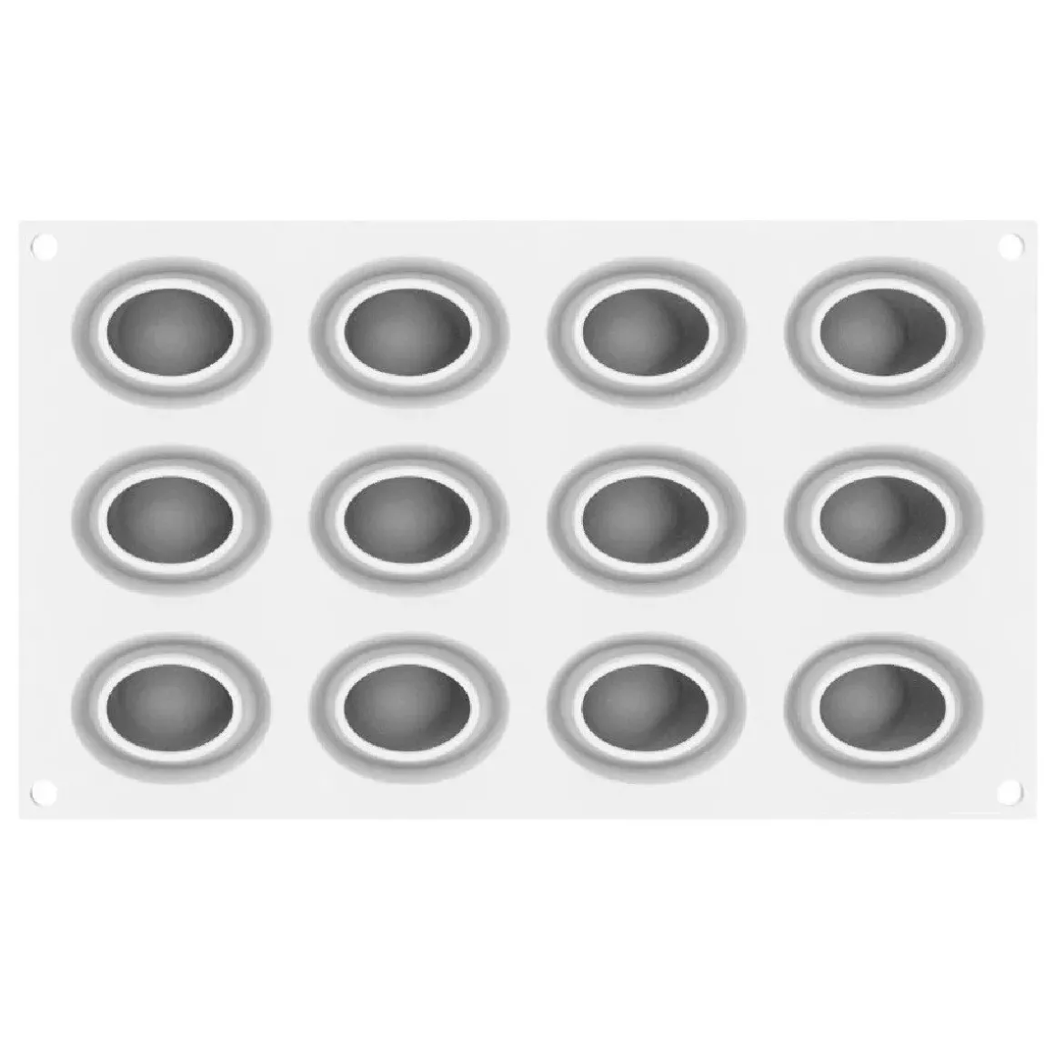 De Silikomart Siliconen Vorm Nebula (12) 5,1×3,7×3,2cm heeft een ovale vorm en een moderne uitstraling. Met de vorm kun je de mooiste gebakjes en desserts creëren. Prachtig om mousse of parfaits in te bereiden.