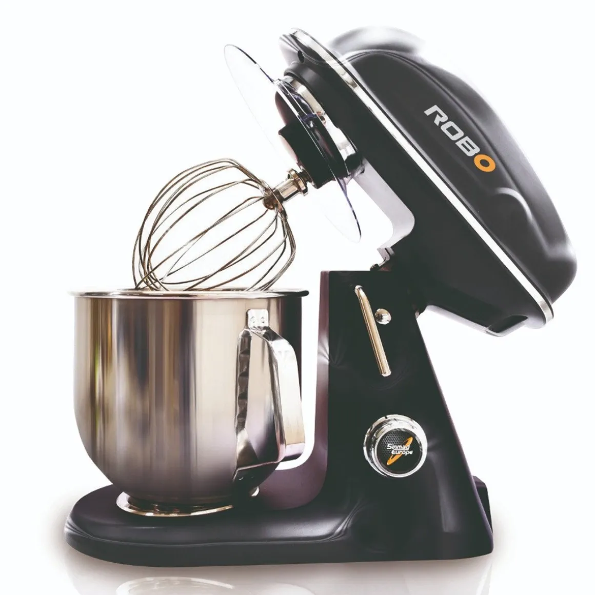 De Sinmag Planeetmenger Robo 7L Zwart Professioneel komt in een zwarte kleur met een fantastisch design. Deze keukenmachine wordt geleverd inclusief beslagkom van 7 liter, een spatdeksel, een deeghaak, beslagvleugel en een eiwitgarde. Aan de zijkant zit een draaiknop, waarmee de snelheid ingesteld kan worden.