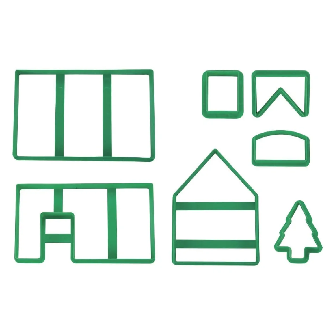 Set van 7 uitstekers voor het maken van een peperkoek huisje. De uitstekers zijn gemaakt van plastic. In de doos zit een handleiding en een recept. Na het uitsteken en bakken van de onderdelen, kunnen ze aan elkaar geplakt worden en kan het huisje versierd worden na eigen smaak.