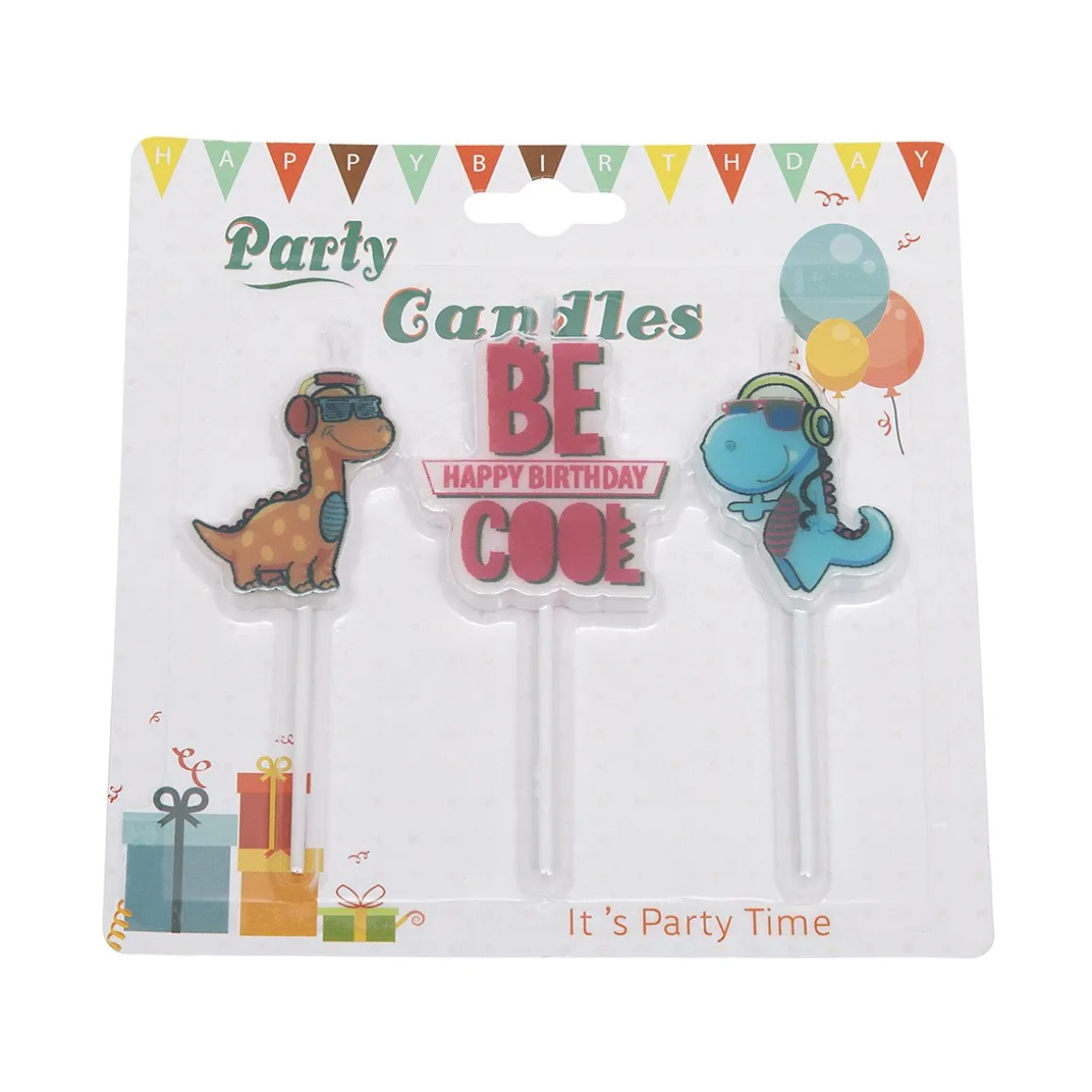 Be Cool, Happy Birthday! Deze set met kaarsen bevat drie verschillende kaarsen, één kaars met “Be Happy Birthday Cool” en twee verschillende dinosaurussen. De kaarsen zijn perfect voor een dino feestje of een andere thema feestje. Wie mag deze coole kaarsen uitblazen?