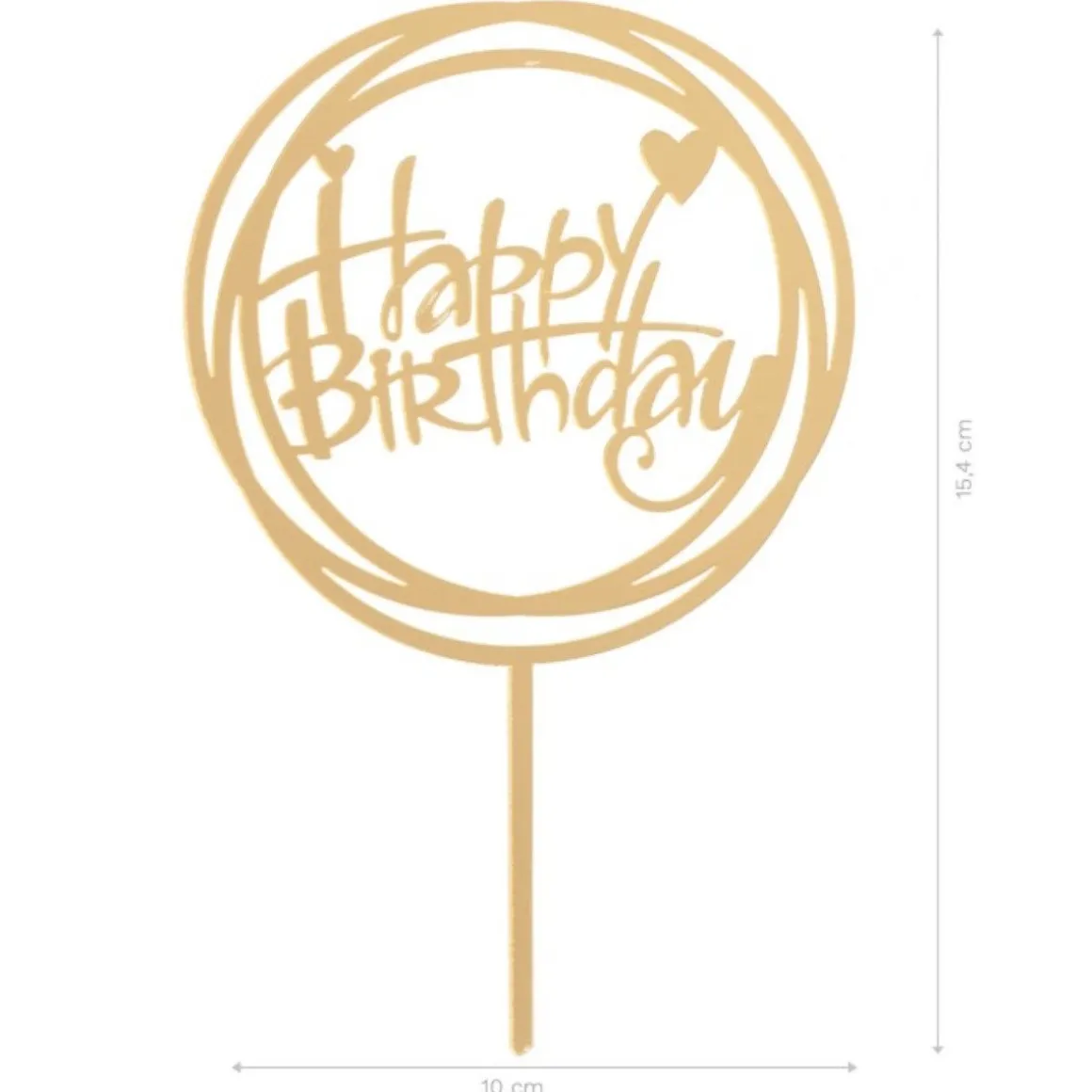 De gouden topper heeft de tekst ‘happy birthday’. Deze tekst staat midden in een cirkel. Verder is de prikker 15,4 centimeter hoog, heeft deze een breedte van 10 centimeter en de dikte van de prikker zelf is een halve centimeter.