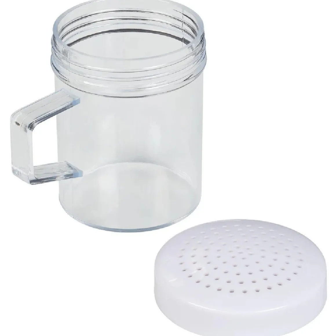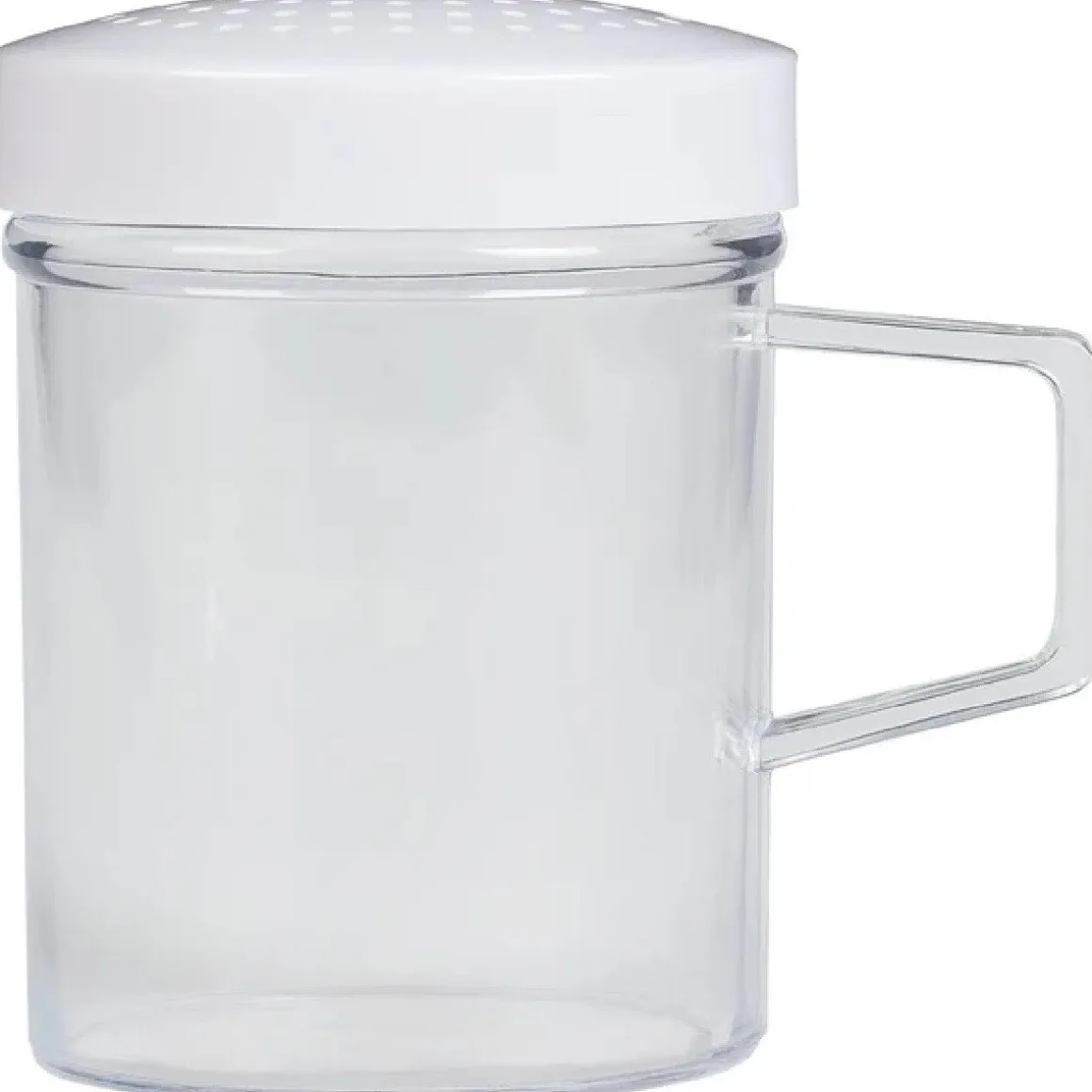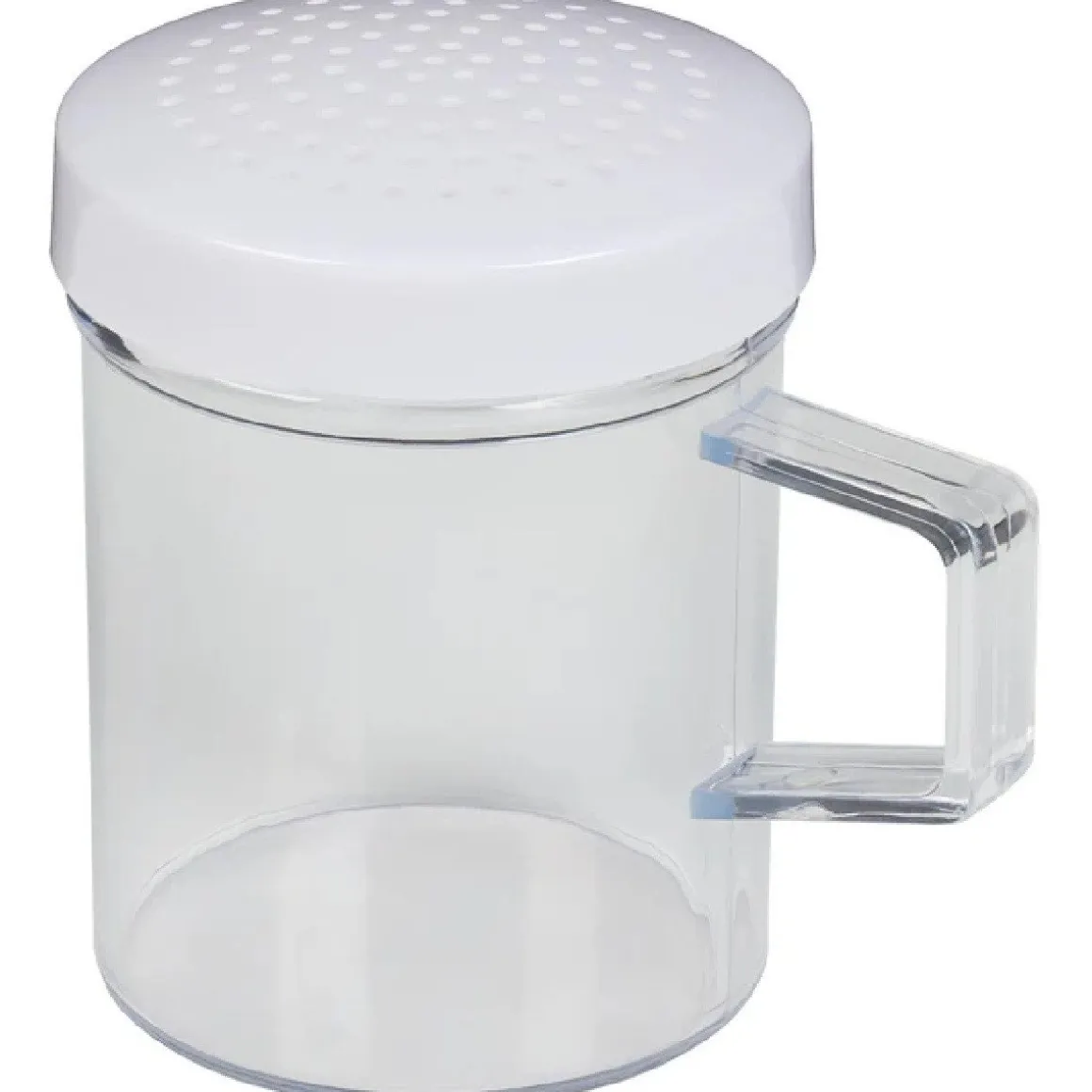 Met een formaat van 8 centimeter hoog en een 7 centimeter doorsnede past hij perfect in de hand. Het transparante kunststof maakt het daarnaast eenvoudig om te zien hoeveel er nog in zit. Ideaal om een taart af te werken met een poederlaagje of als je een werkblad licht wilt bestuiven met bloem